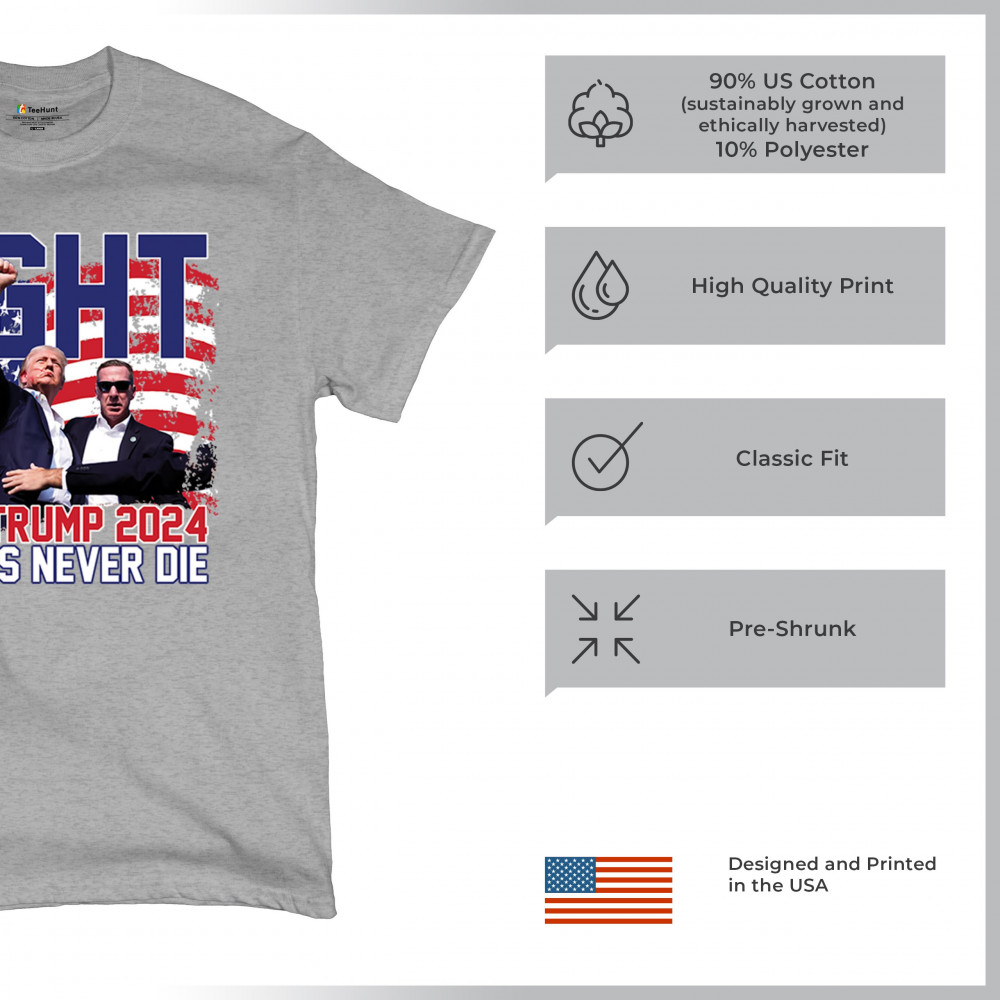 Stand proud and show your support for the Trump 2024 campaign with our exclusive "Fight" design. This striking graphic features Donald Trump alongside the inspiring phrase "Legends Never Die," set against a patriotic American flag backdrop. Ideal for rally events and everyday wear, this design captures the spirit of determination and victory. It’s perfect for those who stand by conservative values and trust in Trump's leadership. Celebrate your patriotism and join fellow supporters in making a bold statement for America's future with this must-have design.