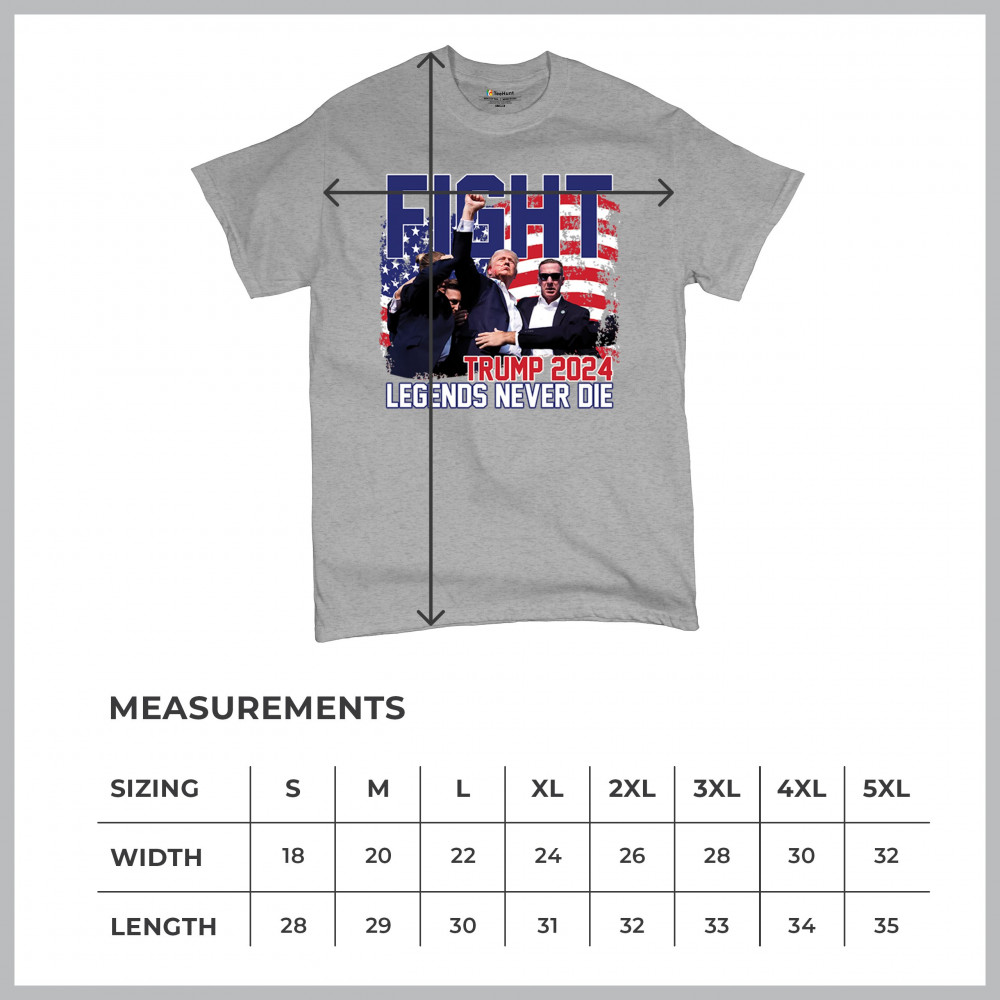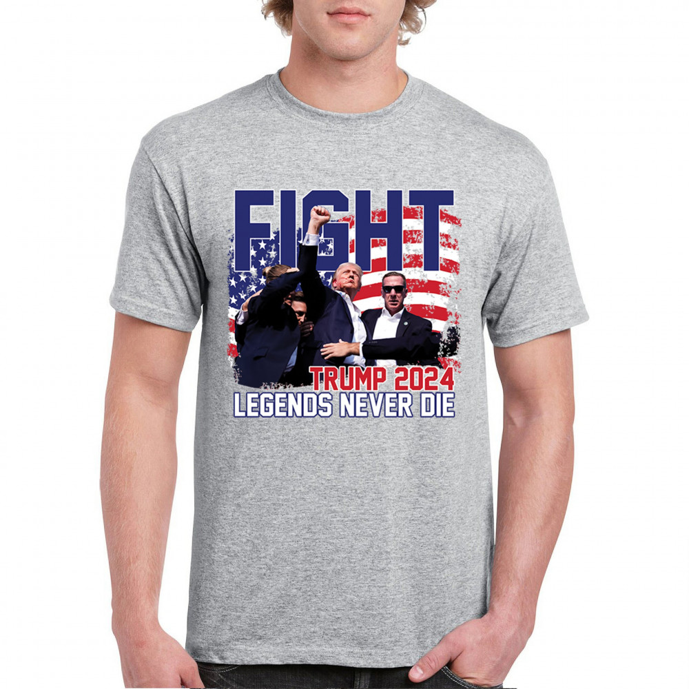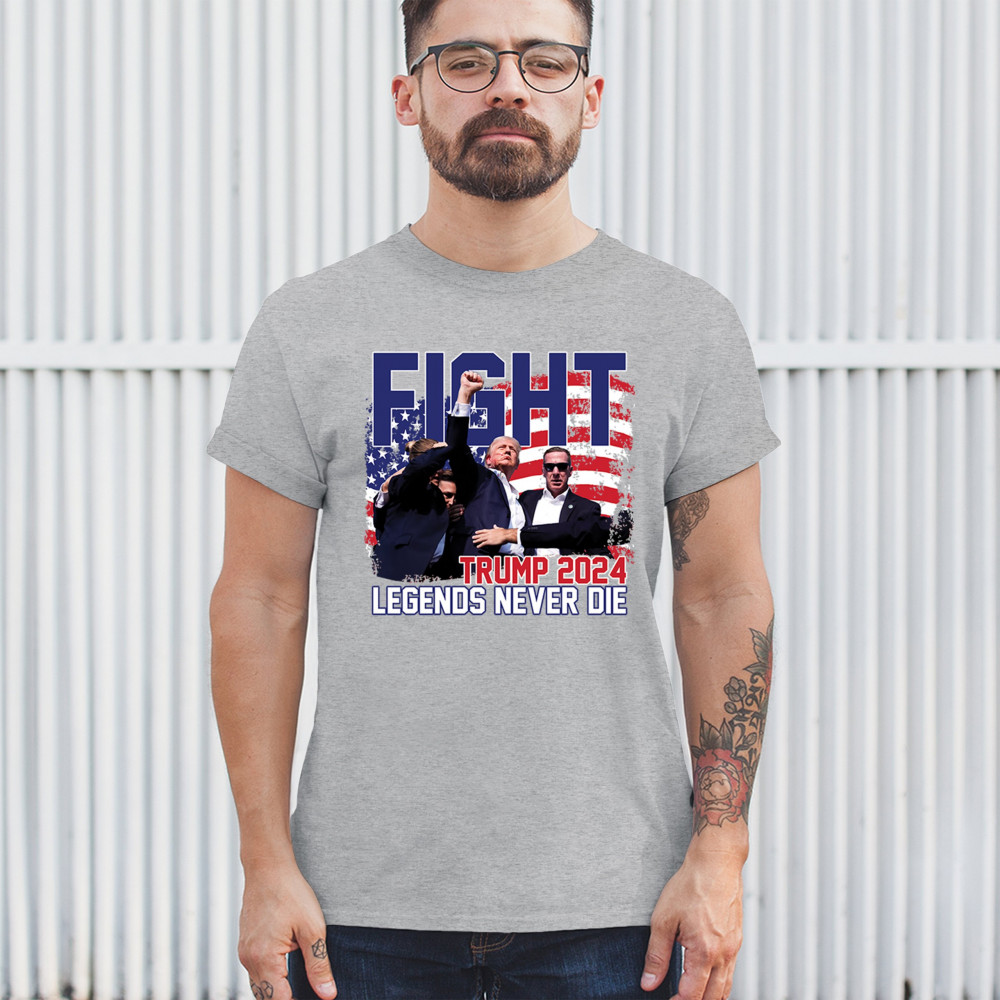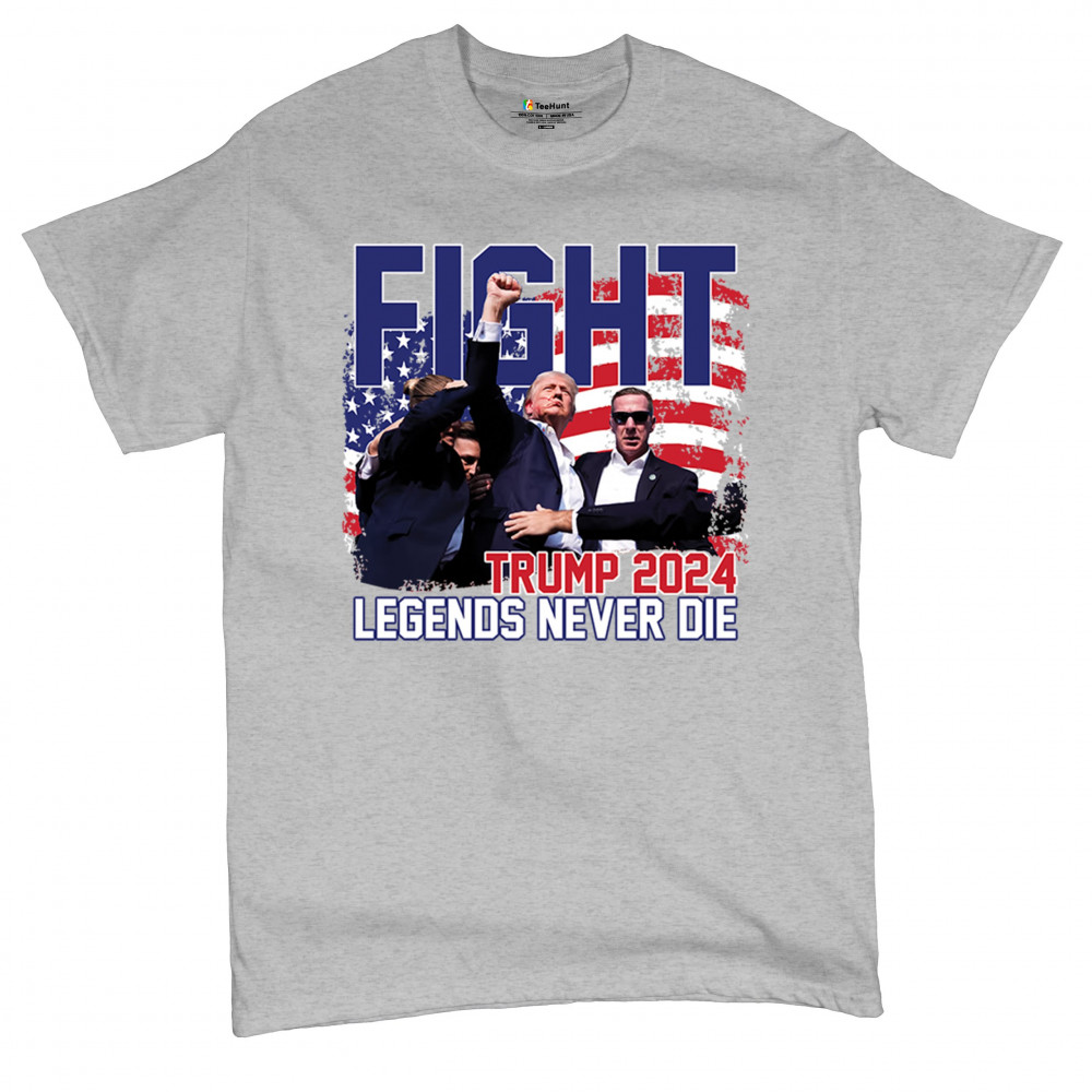 Show your Trump 2024 support with our bold "Fight" design, featuring "Legends Never Die" and a patriotic American flag. Perfect for rallies and everyday wear.