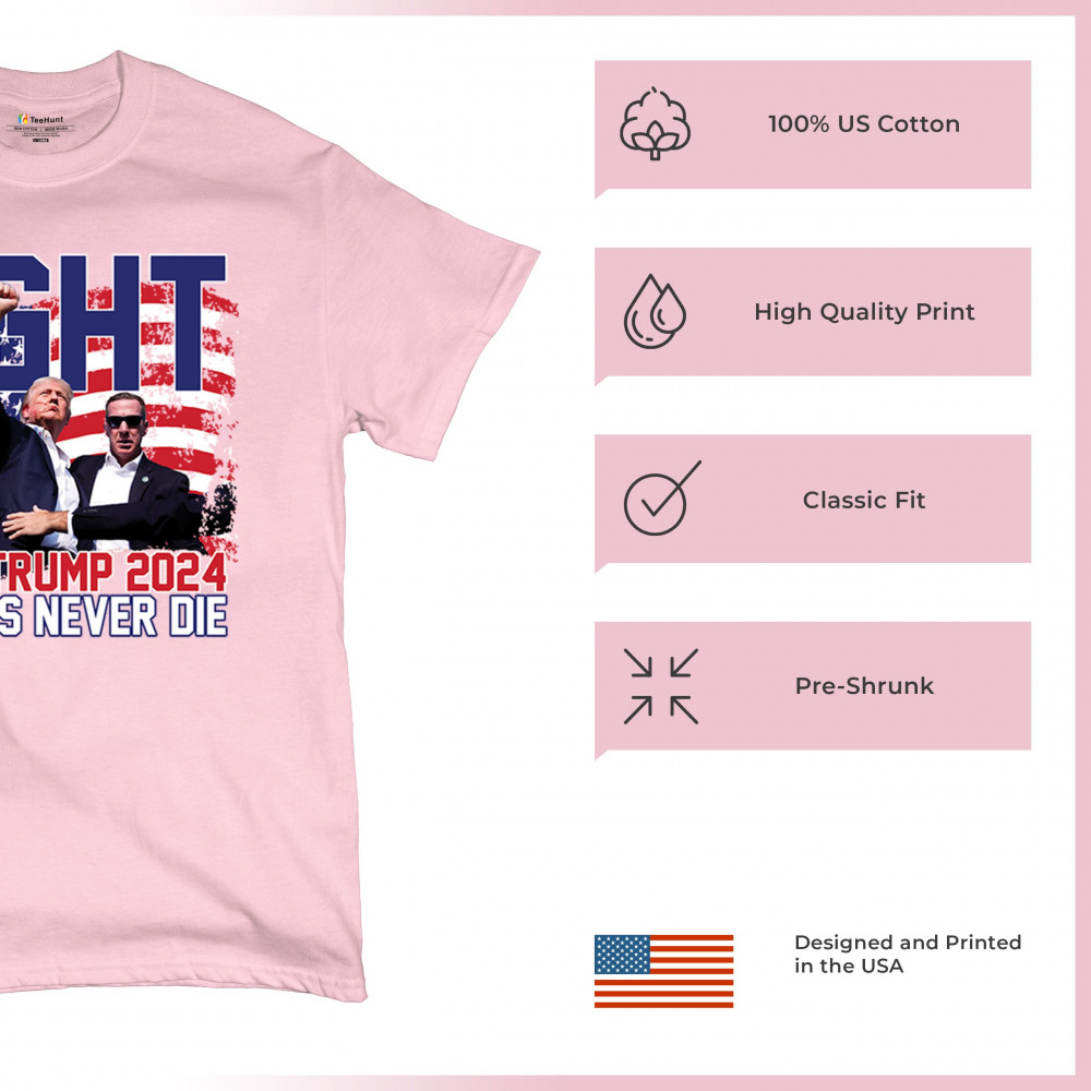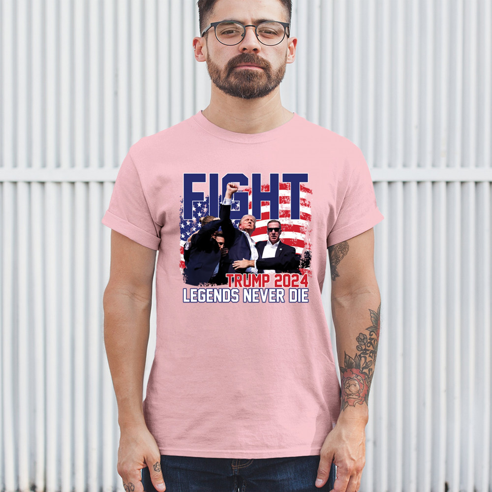 Show your Trump 2024 support with our bold "Fight" design, featuring "Legends Never Die" and a patriotic American flag. Perfect for rallies and everyday wear.