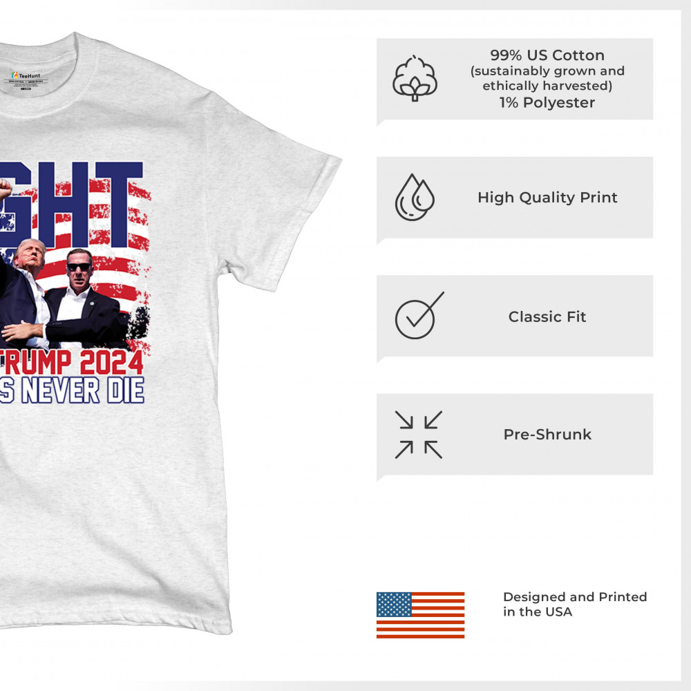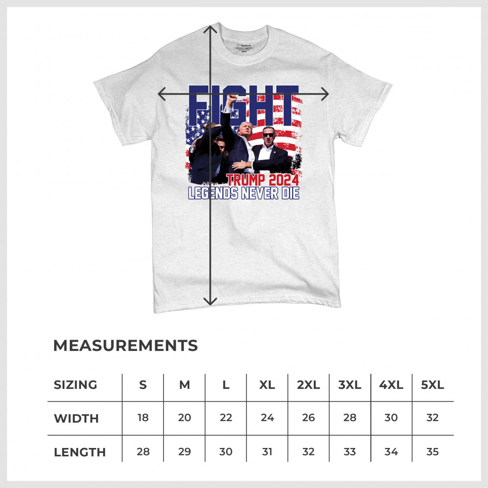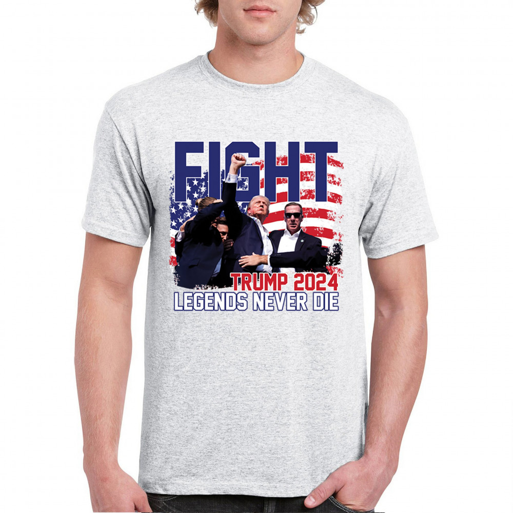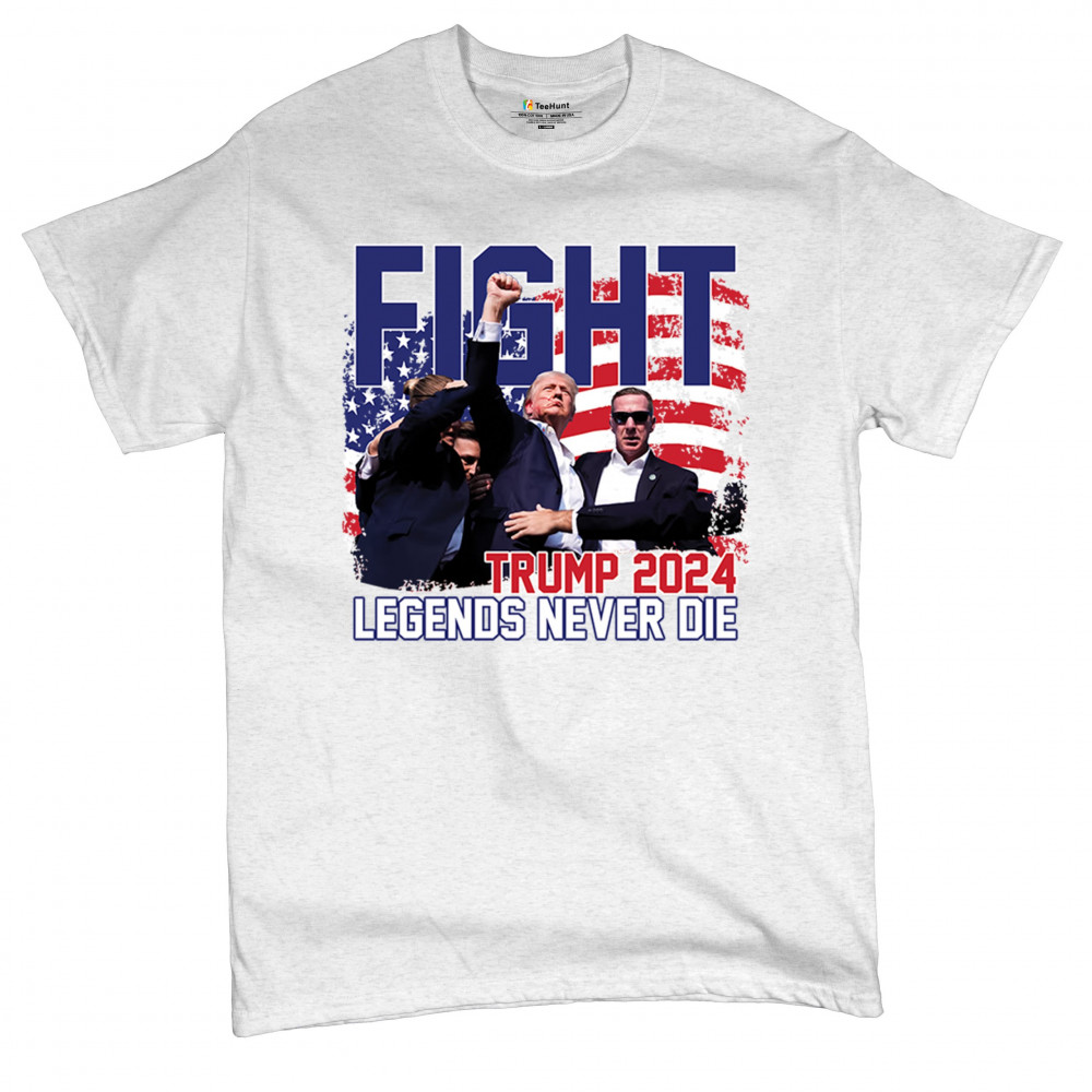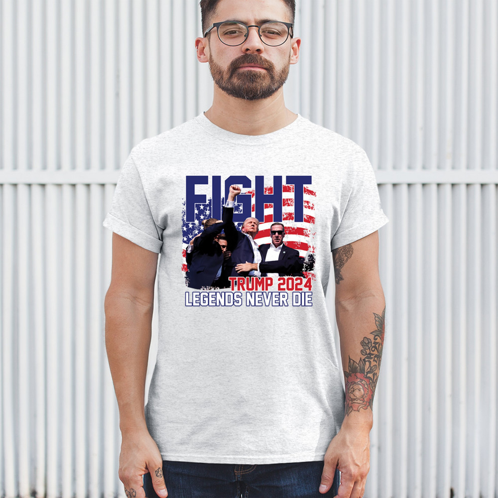 Show your Trump 2024 support with our bold "Fight" design, featuring "Legends Never Die" and a patriotic American flag. Perfect for rallies and everyday wear.