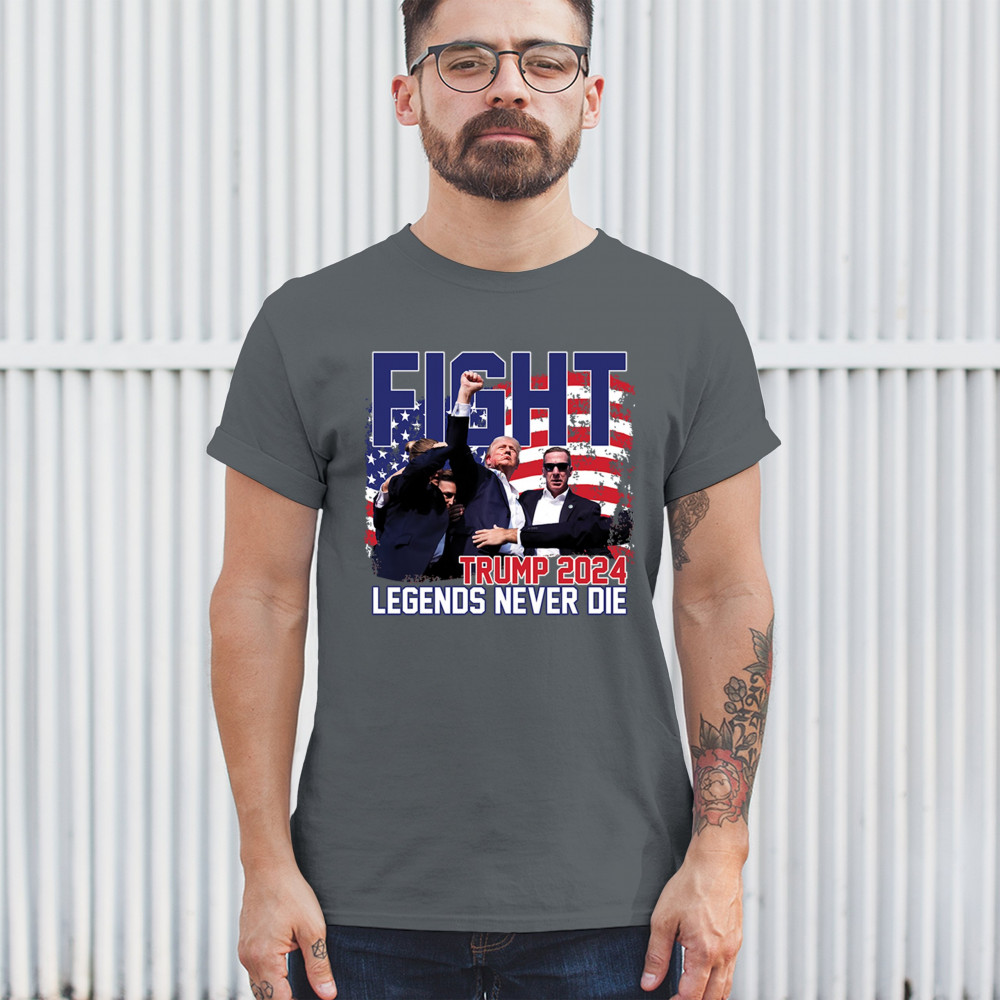 Show your Trump 2024 support with our bold "Fight" design, featuring "Legends Never Die" and a patriotic American flag. Perfect for rallies and everyday wear.