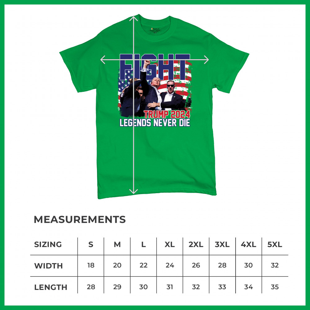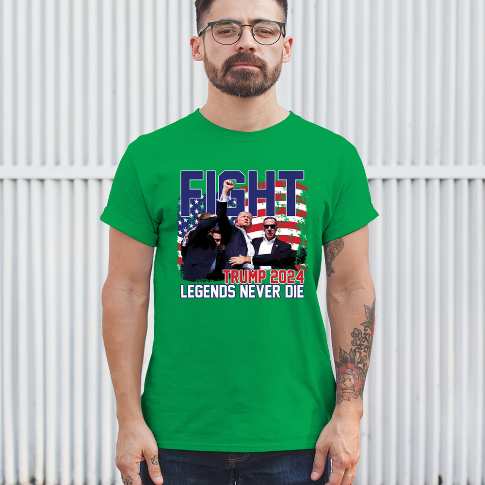 Show your Trump 2024 support with our bold "Fight" design, featuring "Legends Never Die" and a patriotic American flag. Perfect for rallies and everyday wear.