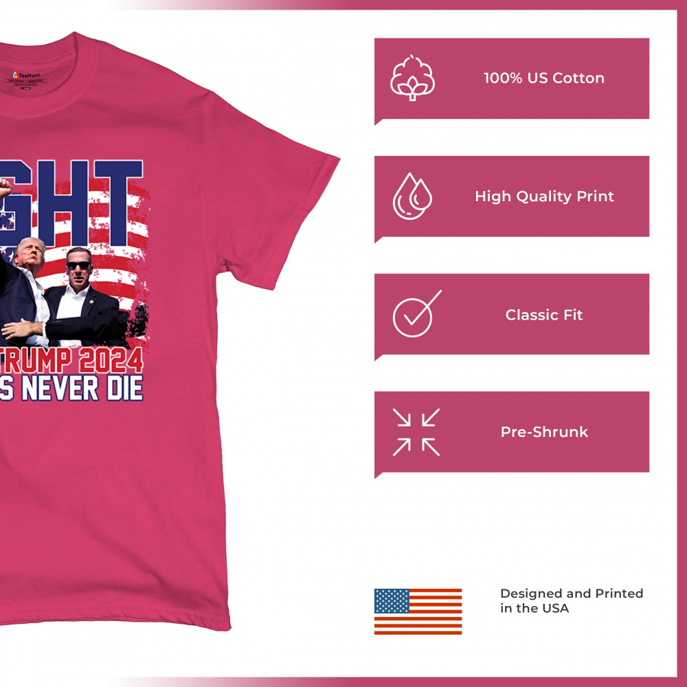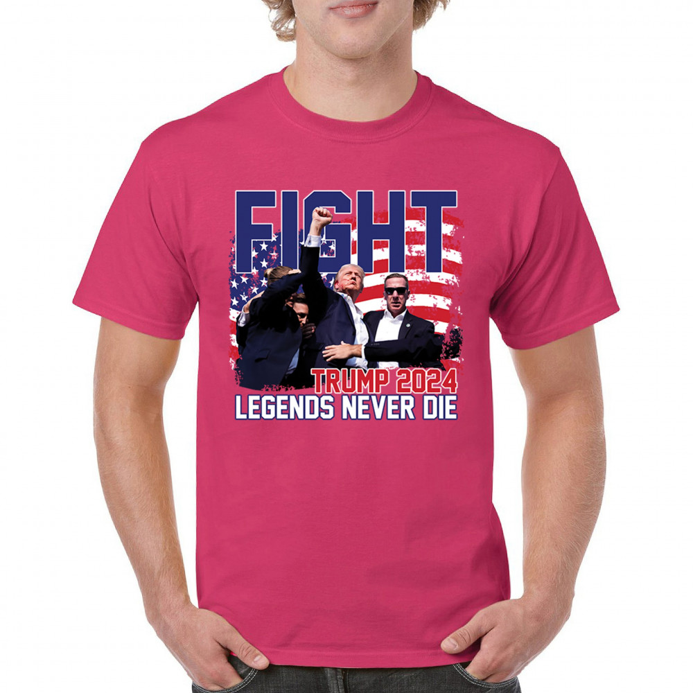 Stand proud and show your support for the Trump 2024 campaign with our exclusive "Fight" design. This striking graphic features Donald Trump alongside the inspiring phrase "Legends Never Die," set against a patriotic American flag backdrop. Ideal for rally events and everyday wear, this design captures the spirit of determination and victory. It’s perfect for those who stand by conservative values and trust in Trump's leadership. Celebrate your patriotism and join fellow supporters in making a bold statement for America's future with this must-have design.