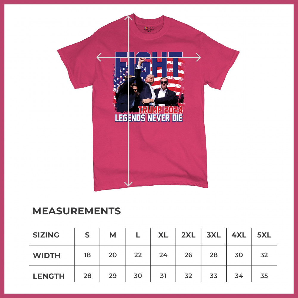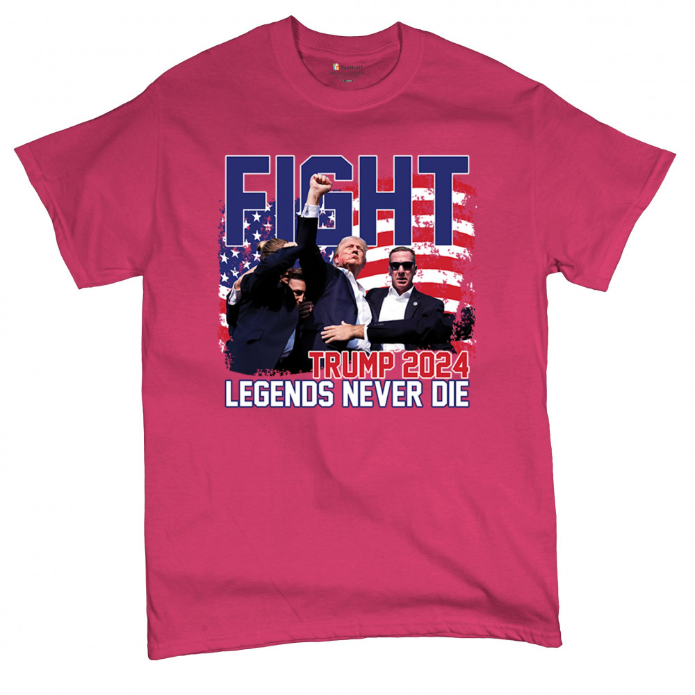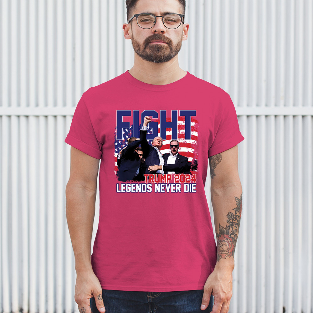 Show your Trump 2024 support with our bold "Fight" design, featuring "Legends Never Die" and a patriotic American flag. Perfect for rallies and everyday wear.