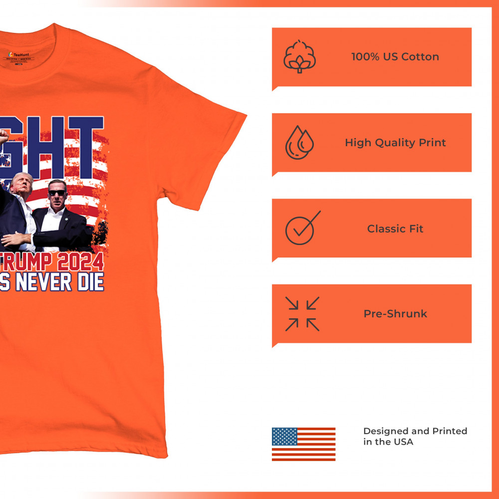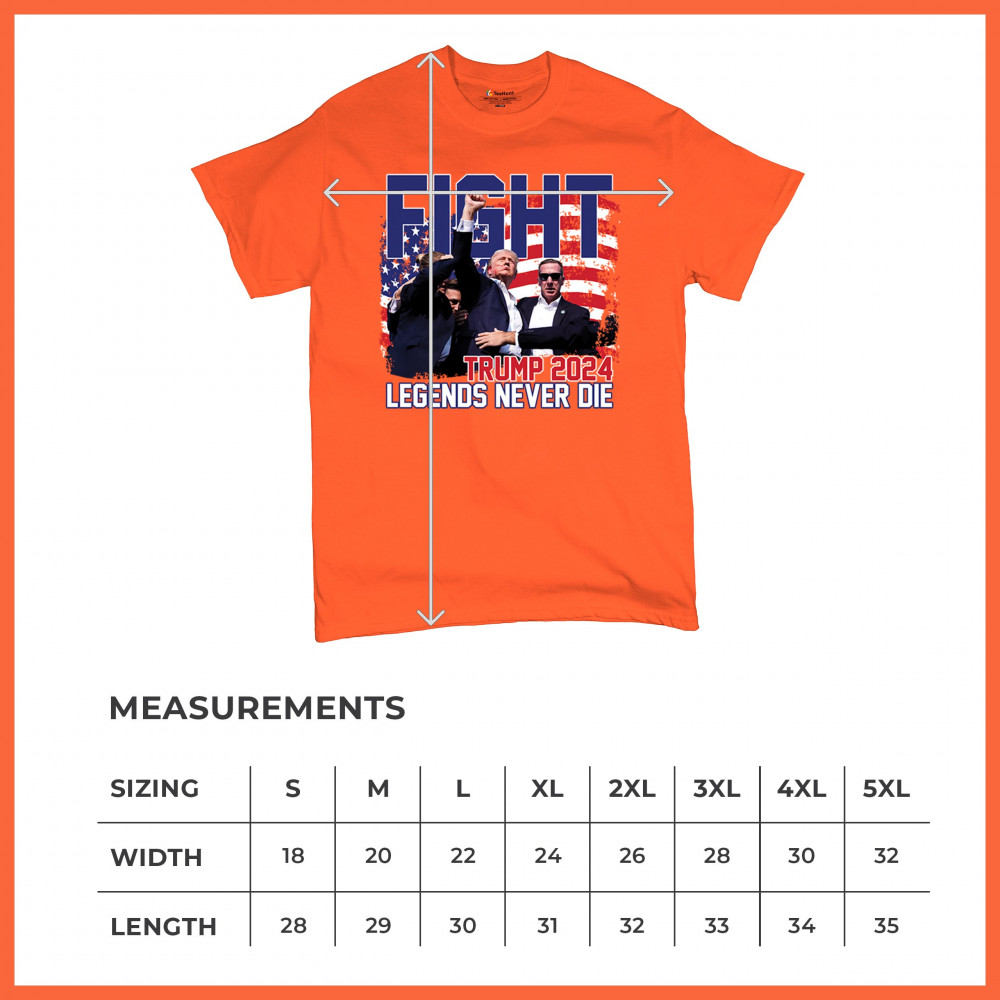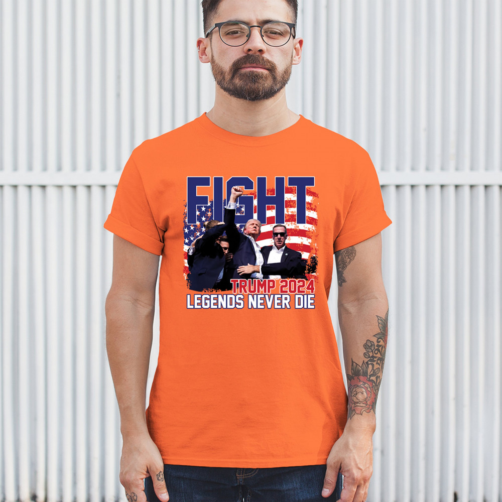 Stand proud and show your support for the Trump 2024 campaign with our exclusive "Fight" design. This striking graphic features Donald Trump alongside the inspiring phrase "Legends Never Die," set against a patriotic American flag backdrop. Ideal for rally events and everyday wear, this design captures the spirit of determination and victory. It’s perfect for those who stand by conservative values and trust in Trump's leadership. Celebrate your patriotism and join fellow supporters in making a bold statement for America's future with this must-have design.