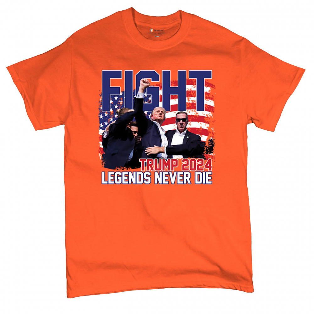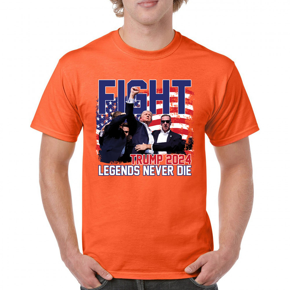 Show your Trump 2024 support with our bold "Fight" design, featuring "Legends Never Die" and a patriotic American flag. Perfect for rallies and everyday wear.