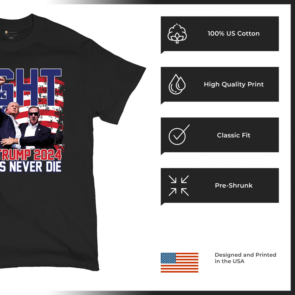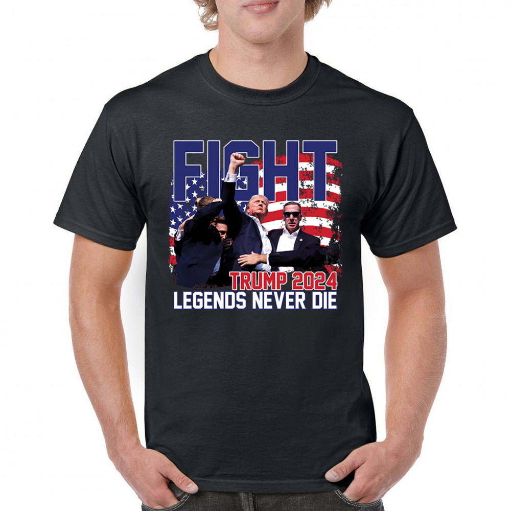Stand proud and show your support for the Trump 2024 campaign with our exclusive "Fight" design. This striking graphic features Donald Trump alongside the inspiring phrase "Legends Never Die," set against a patriotic American flag backdrop. Ideal for rally events and everyday wear, this design captures the spirit of determination and victory. It’s perfect for those who stand by conservative values and trust in Trump's leadership. Celebrate your patriotism and join fellow supporters in making a bold statement for America's future with this must-have design.
