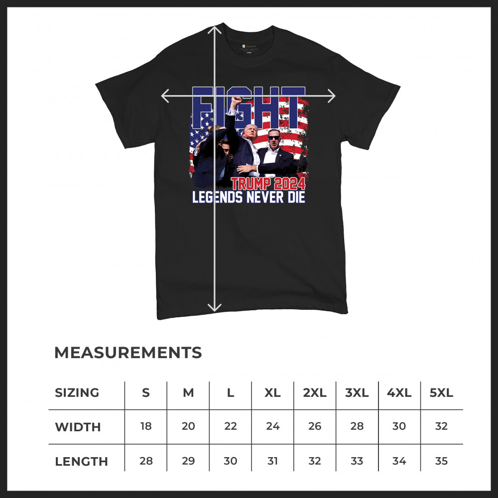 Show your Trump 2024 support with our bold "Fight" design, featuring "Legends Never Die" and a patriotic American flag. Perfect for rallies and everyday wear.