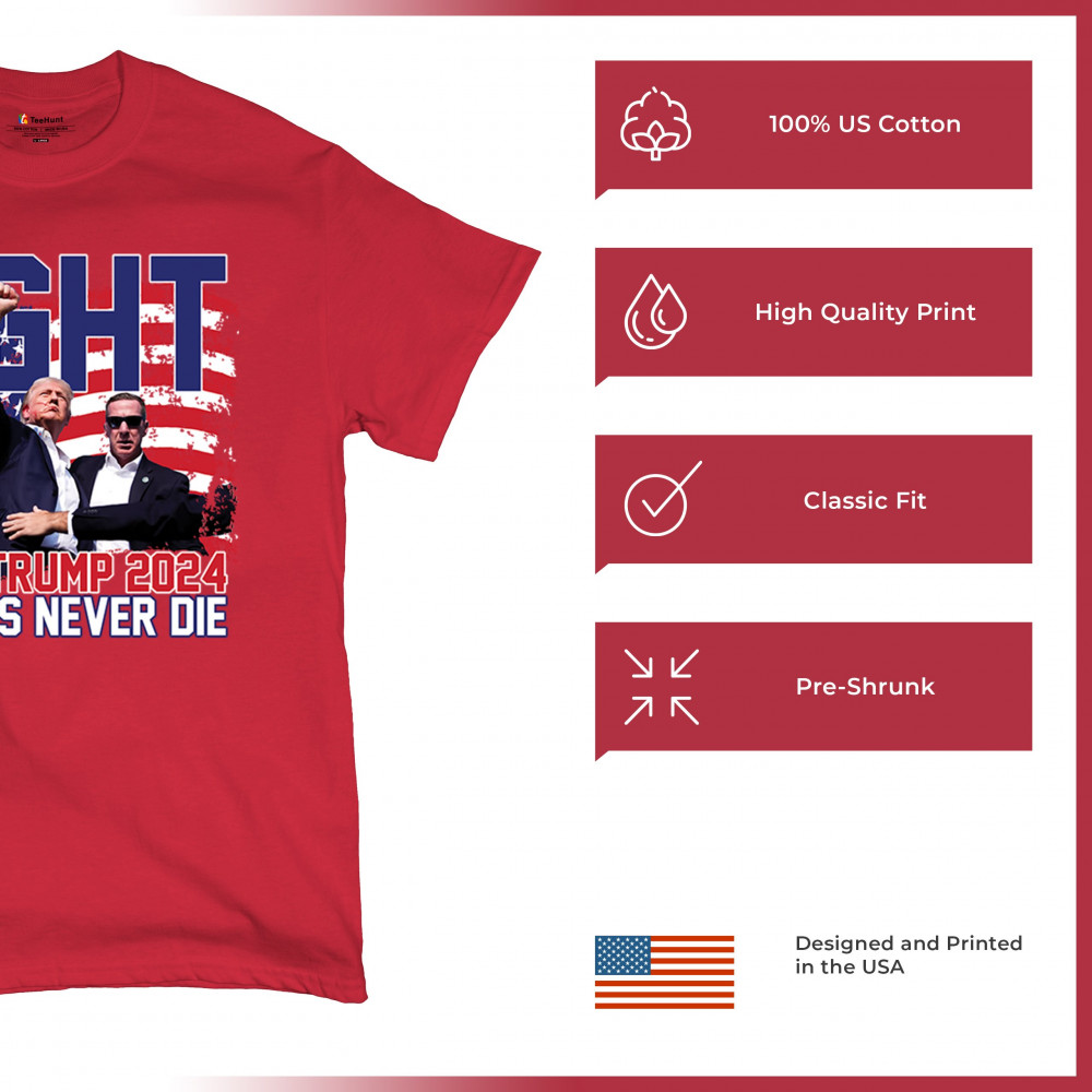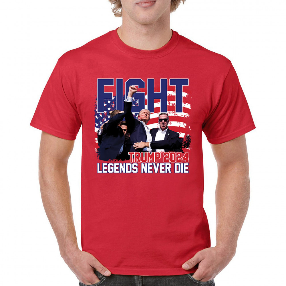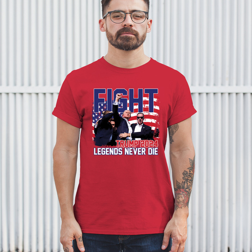 Show your Trump 2024 support with our bold "Fight" design, featuring "Legends Never Die" and a patriotic American flag. Perfect for rallies and everyday wear.