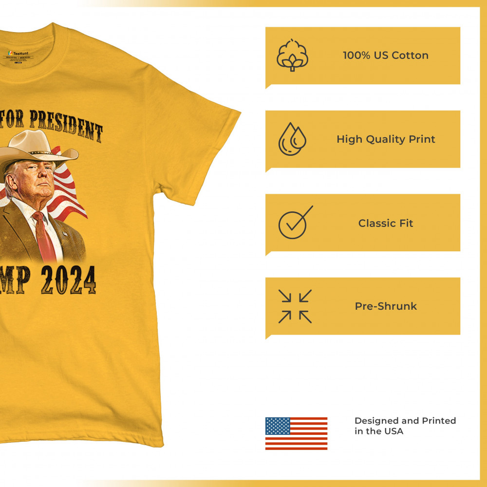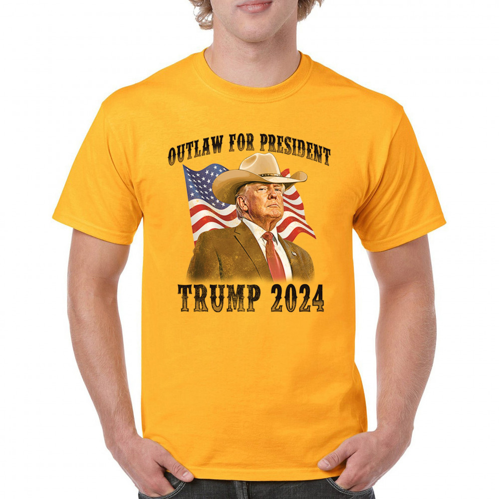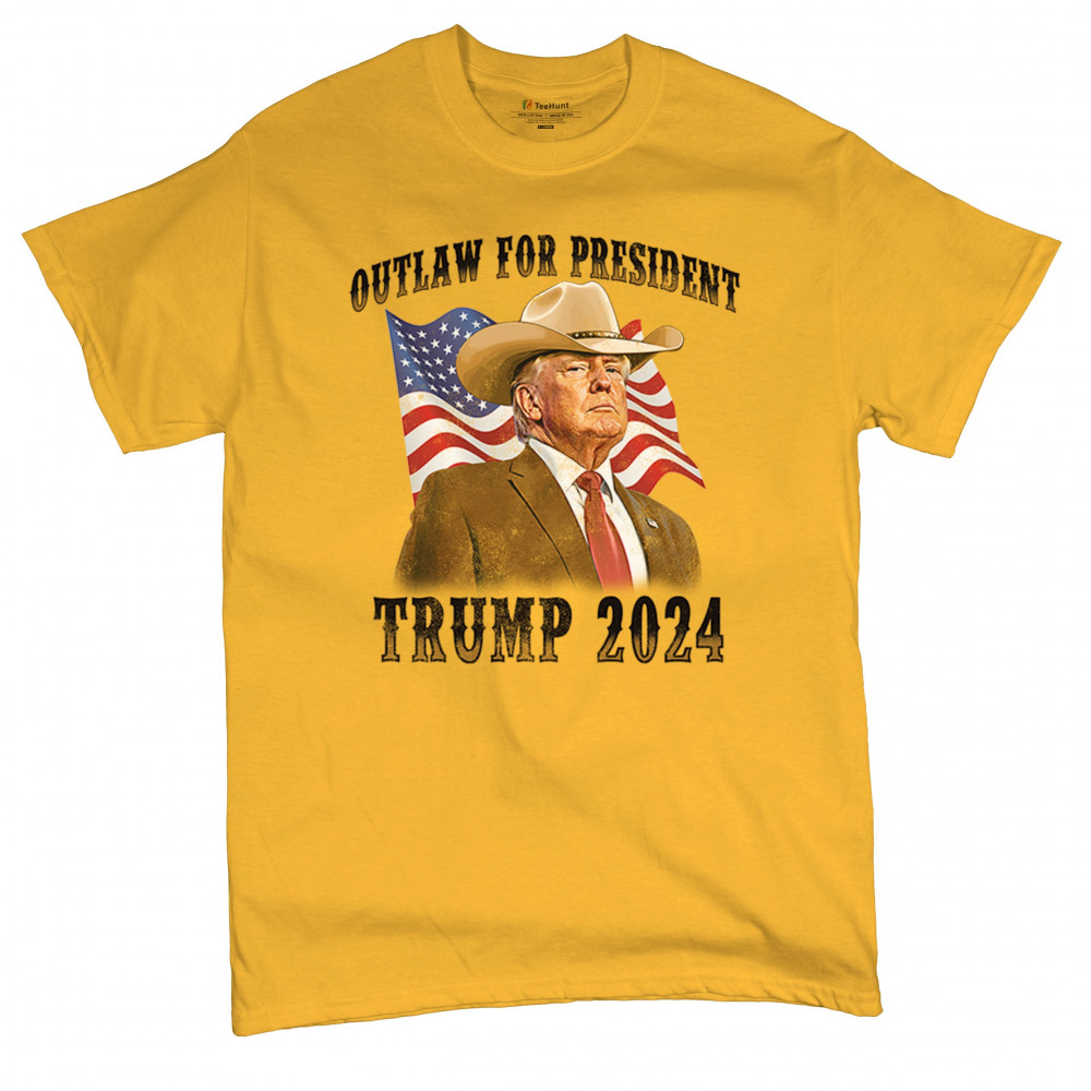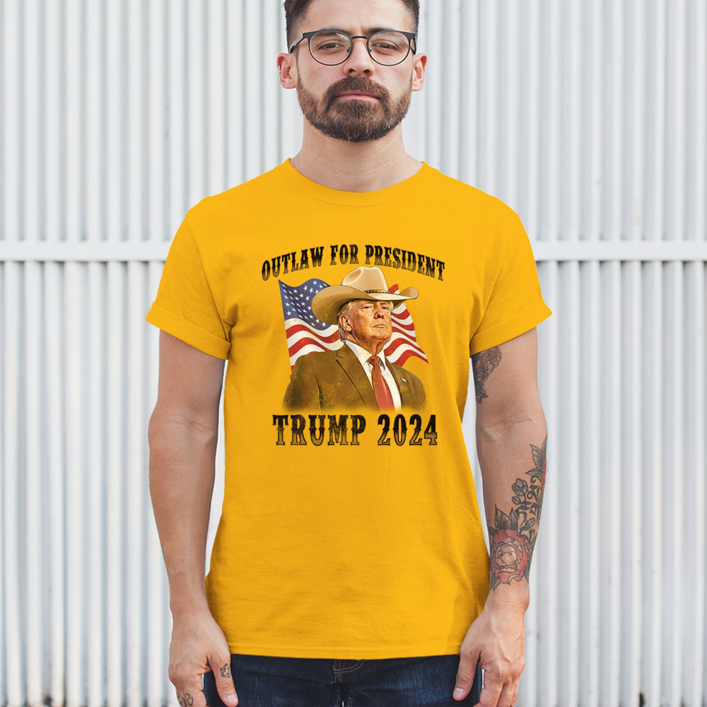 Support Trump with our "Outlaw for President" design. Featuring Trump in a cowboy hat, this piece symbolizes strength amidst political challenges. Join the fight for conservative values!