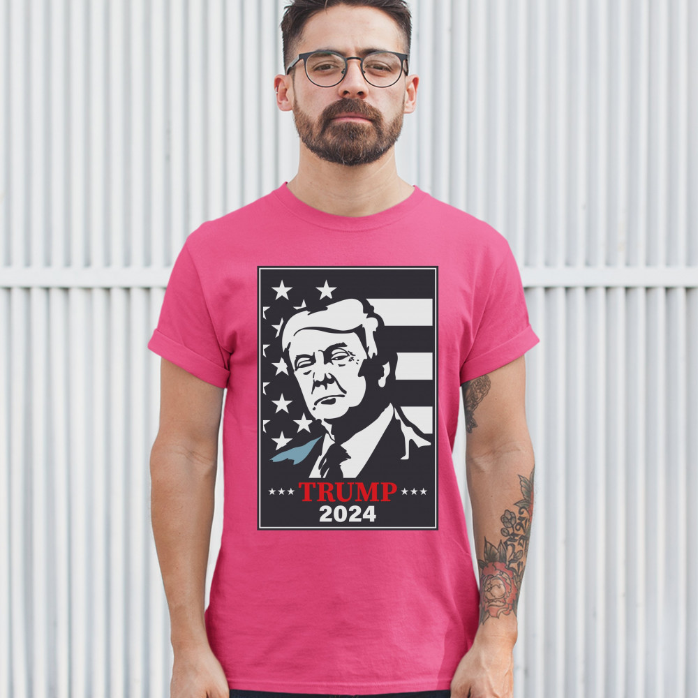 A political print featuring Donald Trump with the American flag in the background. The print says: "Trump 2024". A great choice to show your support for Donald J. Trump - the 45th president of the USA!