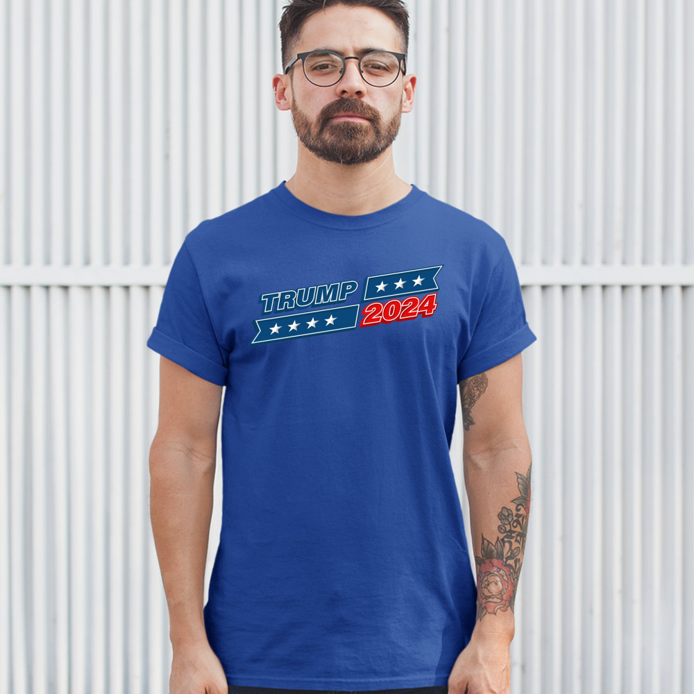 A political print featuring blue stripes with stars and saying "Trump 2024". A great choice to wear for a Trump rally or give as a gift to a Donald Trump supporter before 2024 presidential elections.