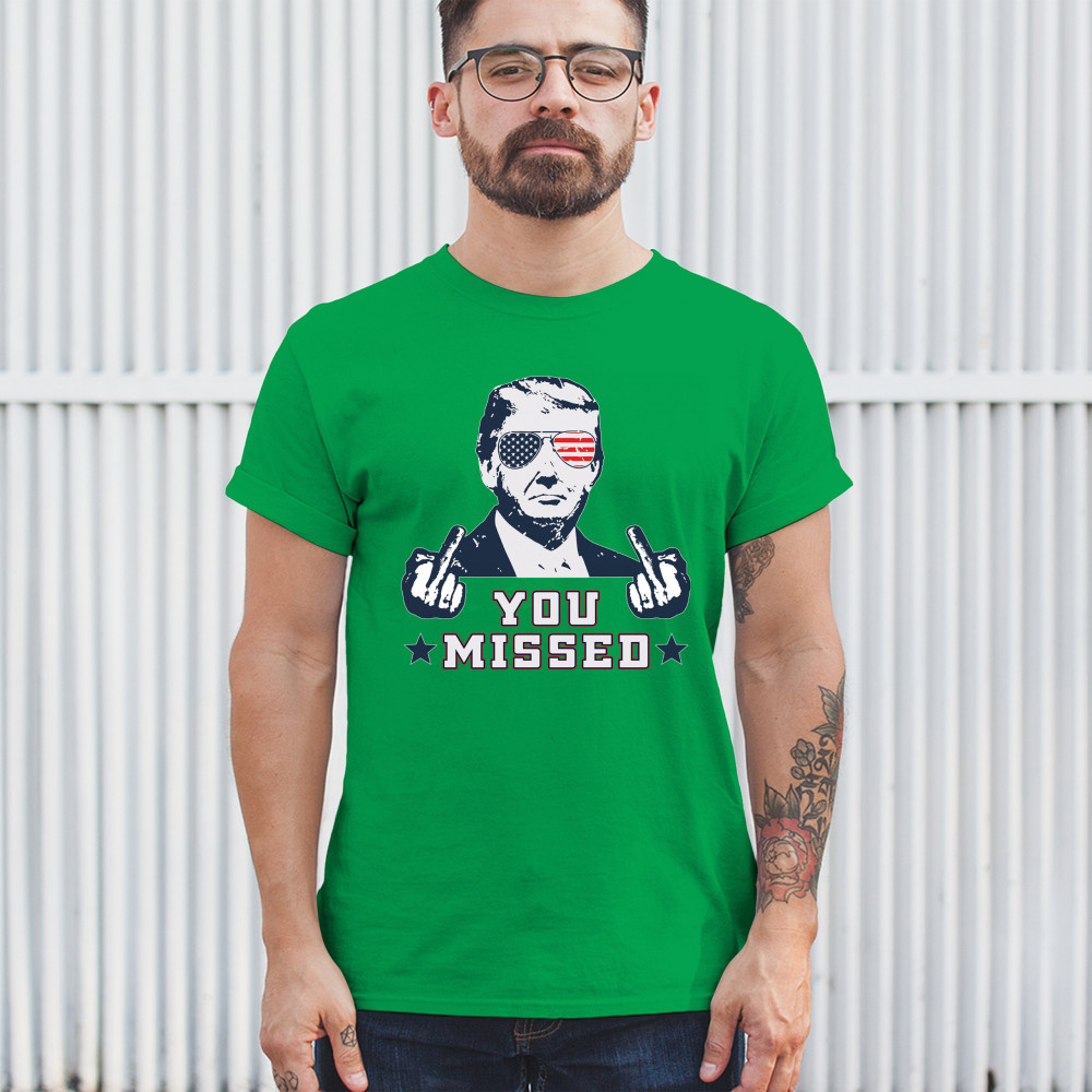 Celebrate Trump's resilience with this bold "You Missed" design. Perfect for rallies and political events. Show your unwavering support for conservative values.