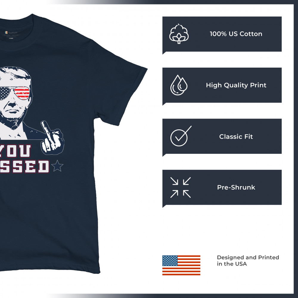 Express your patriotism and support for Donald Trump with this striking "You Missed" design, commemorating his survival of an assassination attempt during a Pennsylvania rally. The design features Trump in American flag sunglasses, defiantly flipping the bird, a bold statement of resilience. Ideal for rallies, political events, or casual wear, it symbolizes strength and unwavering support for conservative values. Show the world where you stand with this unique piece, perfect for any Trump supporter who believes in the America First agenda.