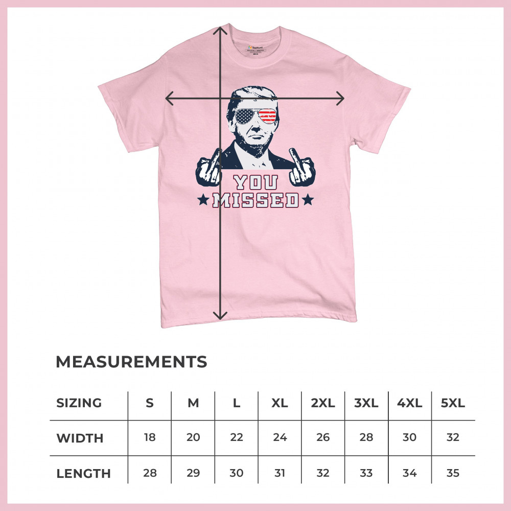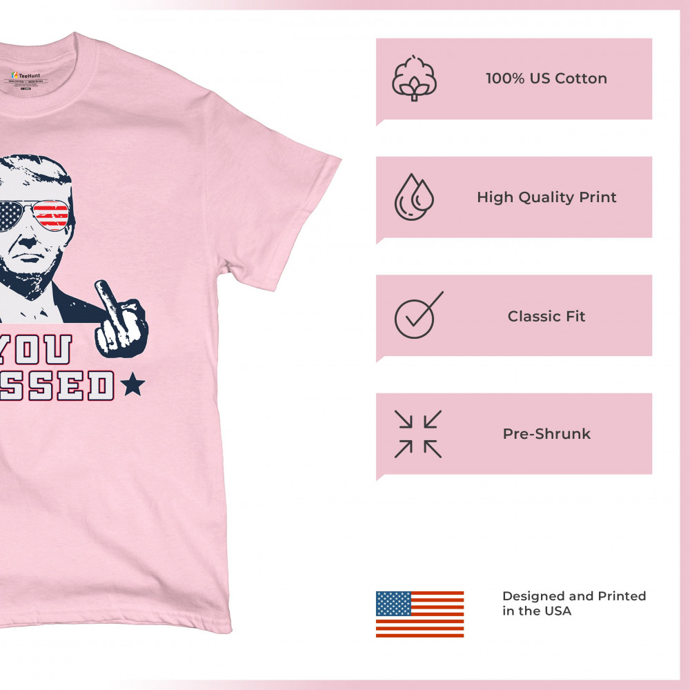 Express your patriotism and support for Donald Trump with this striking "You Missed" design, commemorating his survival of an assassination attempt during a Pennsylvania rally. The design features Trump in American flag sunglasses, defiantly flipping the bird, a bold statement of resilience. Ideal for rallies, political events, or casual wear, it symbolizes strength and unwavering support for conservative values. Show the world where you stand with this unique piece, perfect for any Trump supporter who believes in the America First agenda.