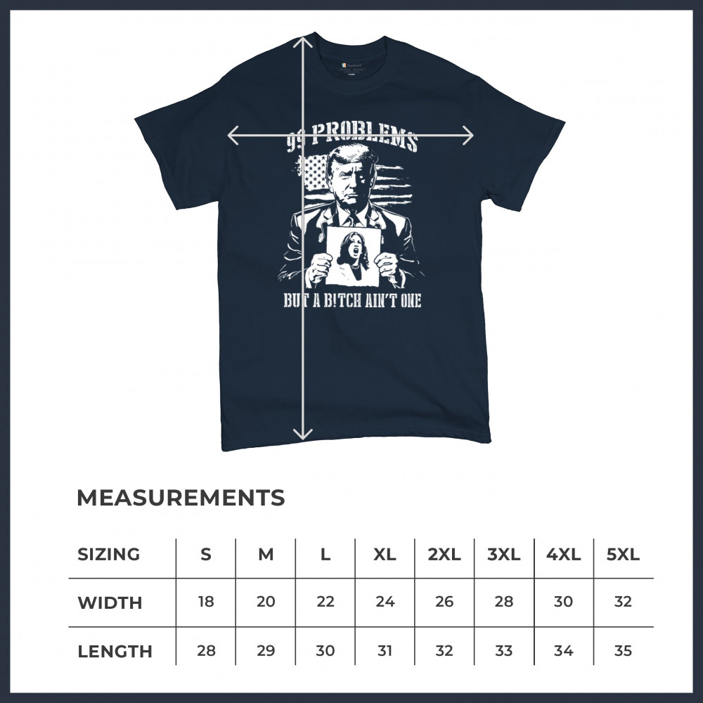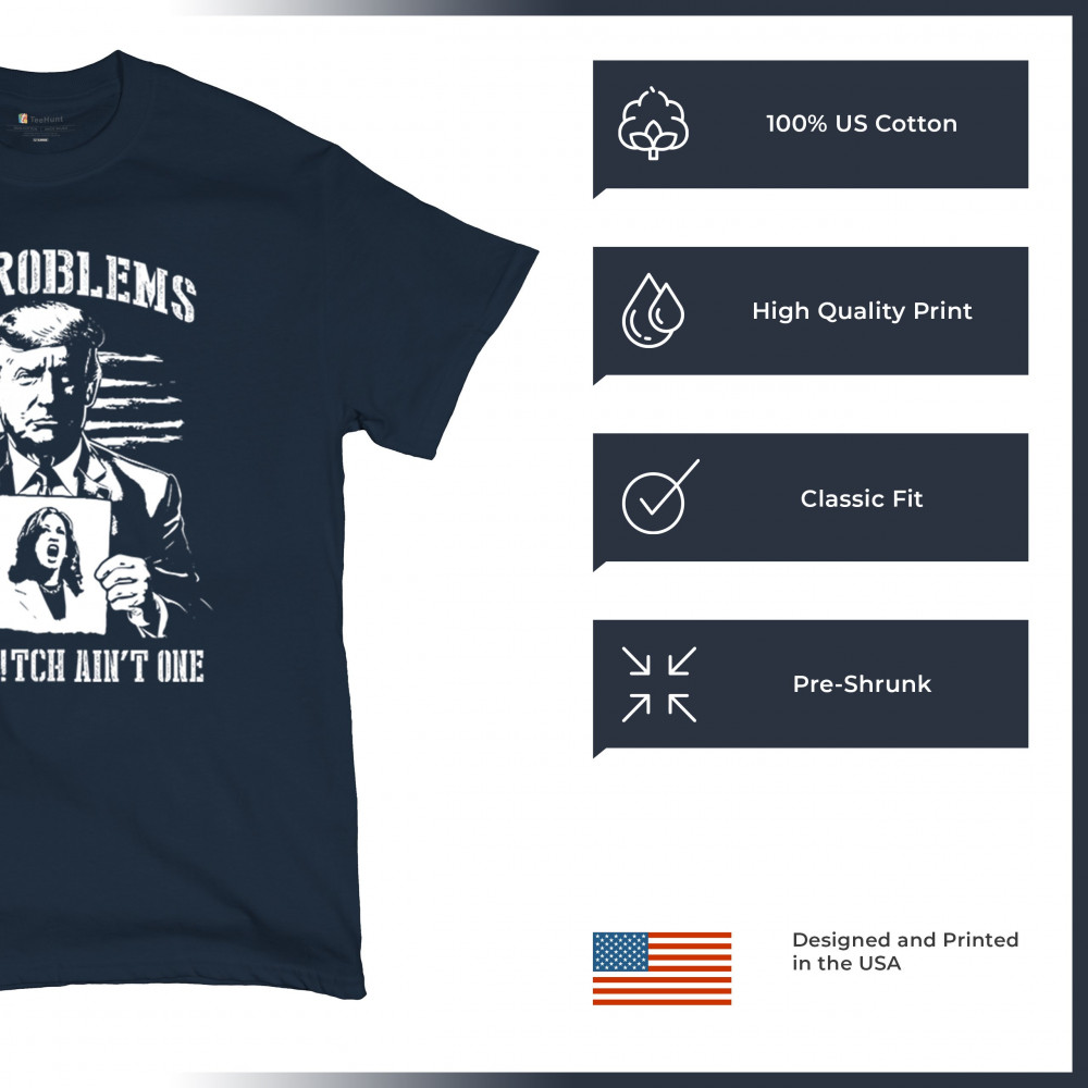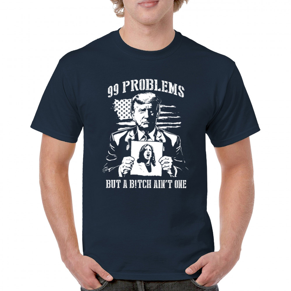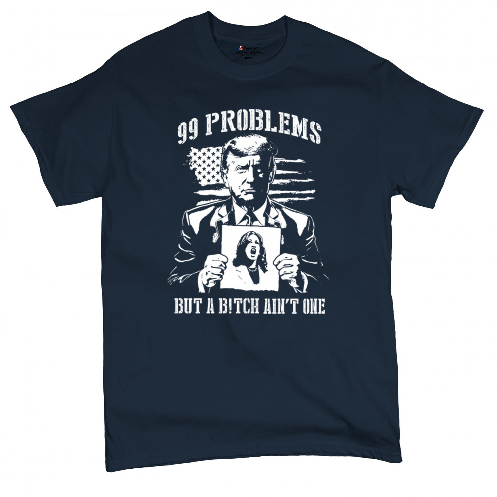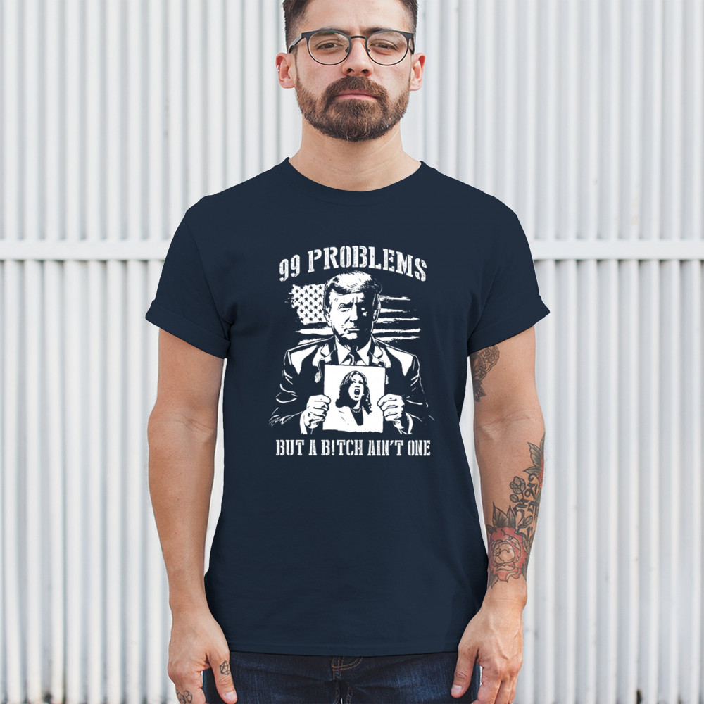 Bold conservative "99 Problems But a B*tch Ain’t One" design featuring Donald J. Trump and an American flag. Perfect for proud Republicans and patriots.