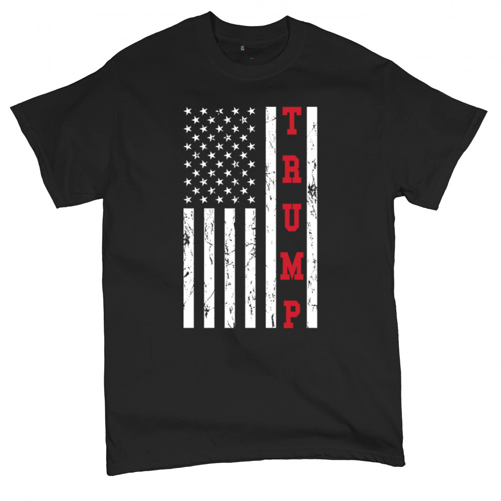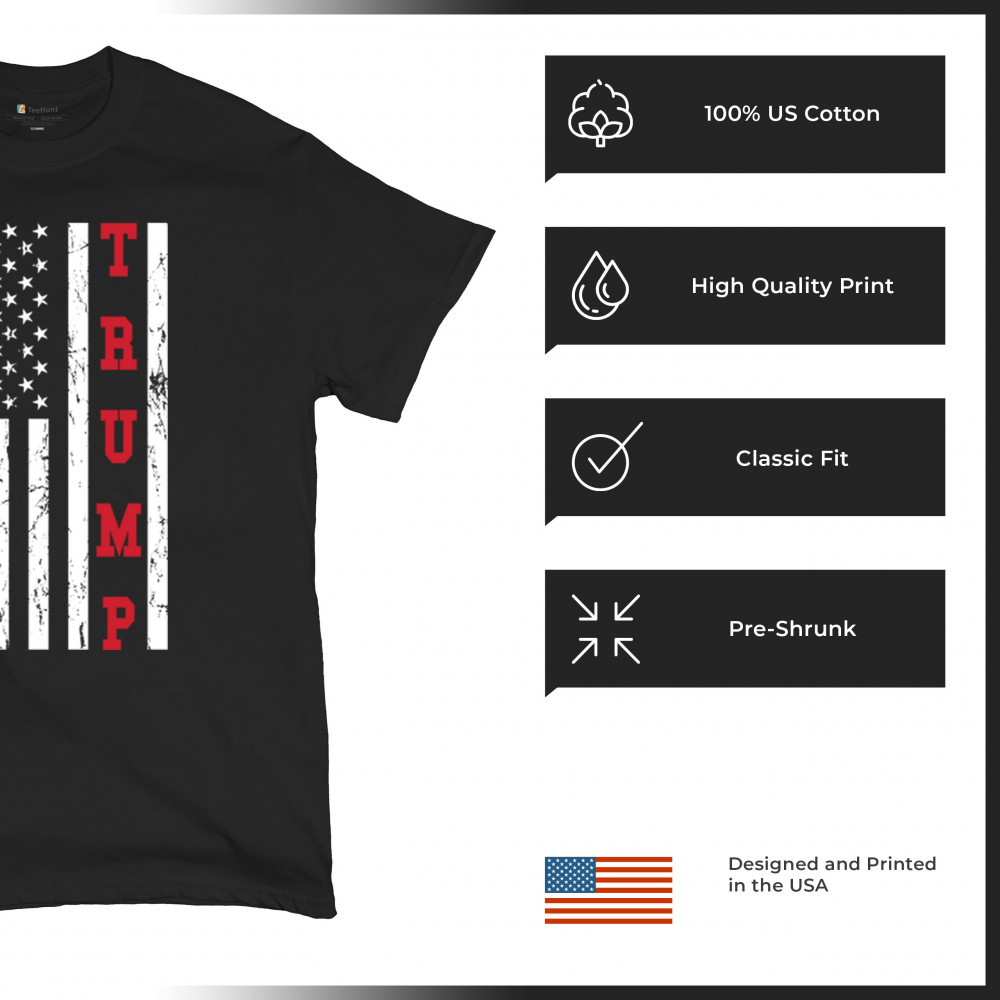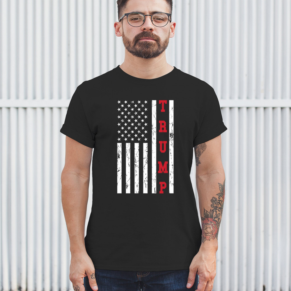 Declare your allegiance to Donald Trump and the Republican cause with our Trump 2024 Flag tee. Featuring a striking American Flag backdrop and 'Trump 2024' emblazoned proudly, this shirt embodies the spirit of Make America Great Again. Send a clear messag