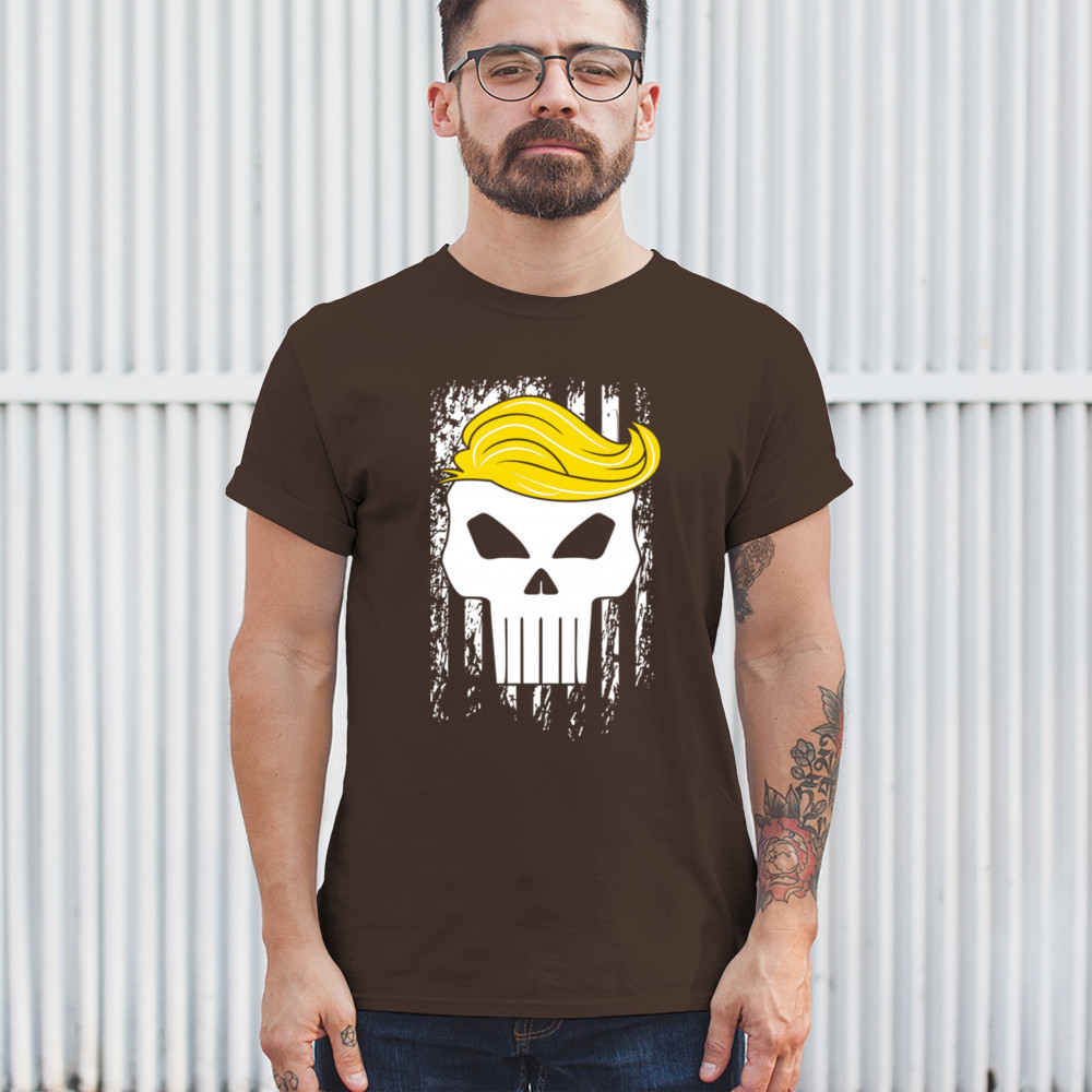 Explore our exclusive design - a symbol of unwavering support for America. Featuring a distressed flag and a skull with Trump's hair, it's perfect for patriotic conservatives