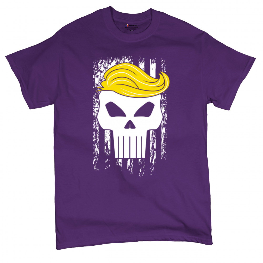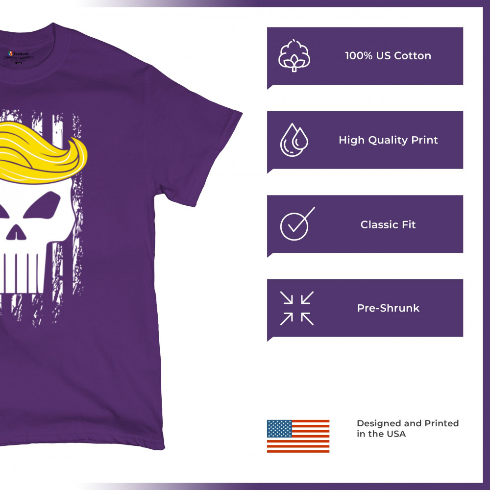 Explore our exclusive design - a symbol of unwavering support for America. Featuring a distressed flag and a skull with Trump's hair, it's perfect for patriotic conservatives