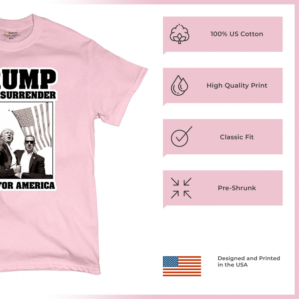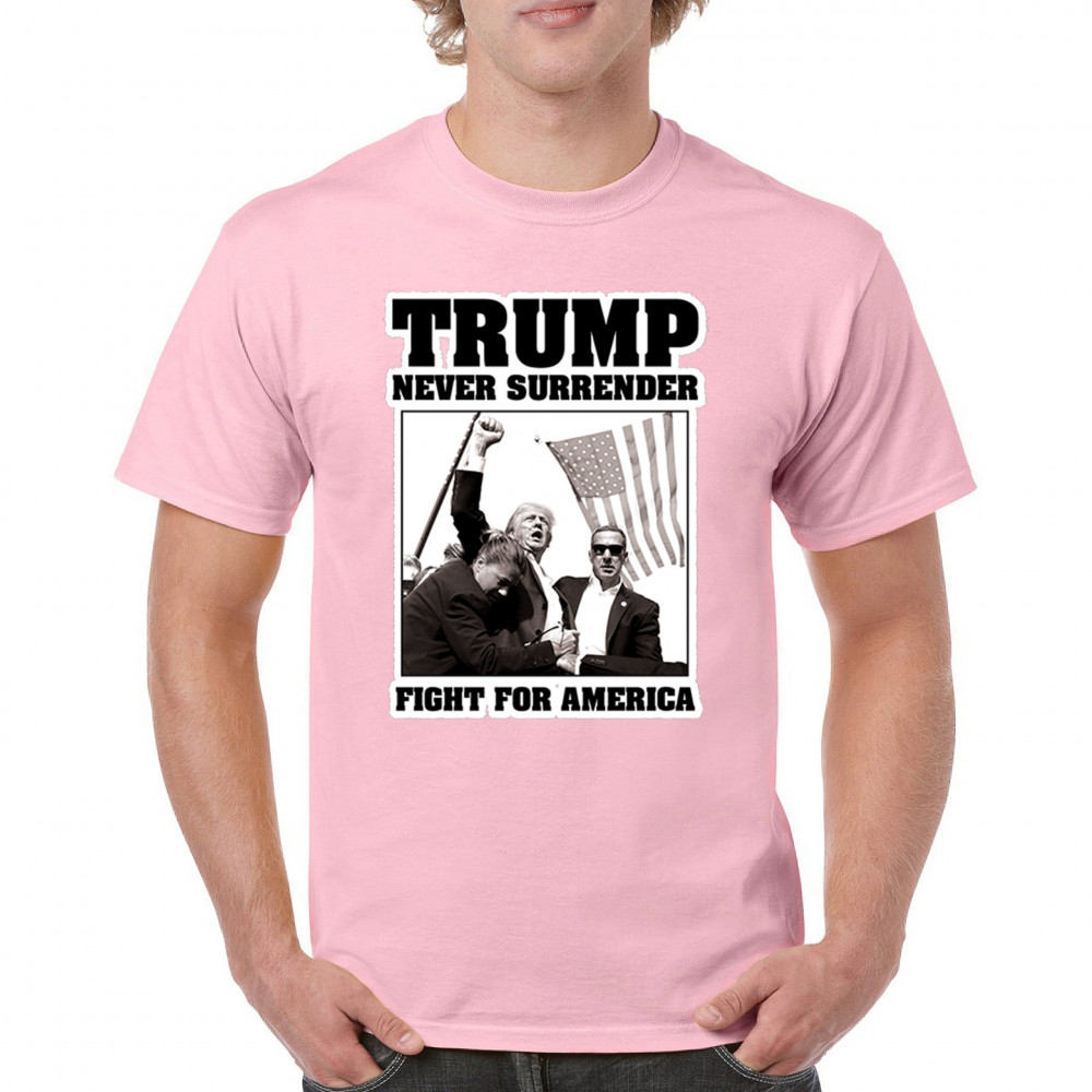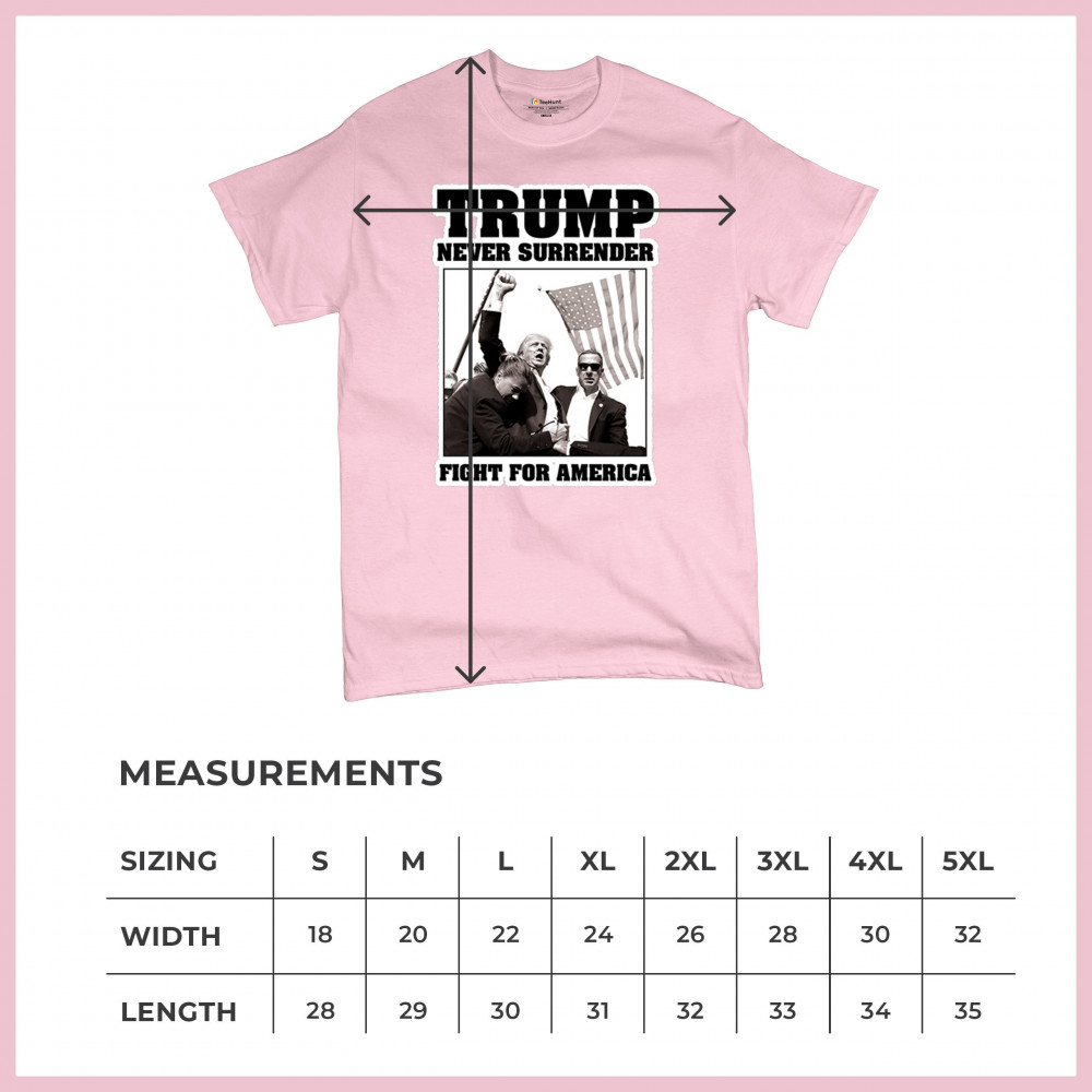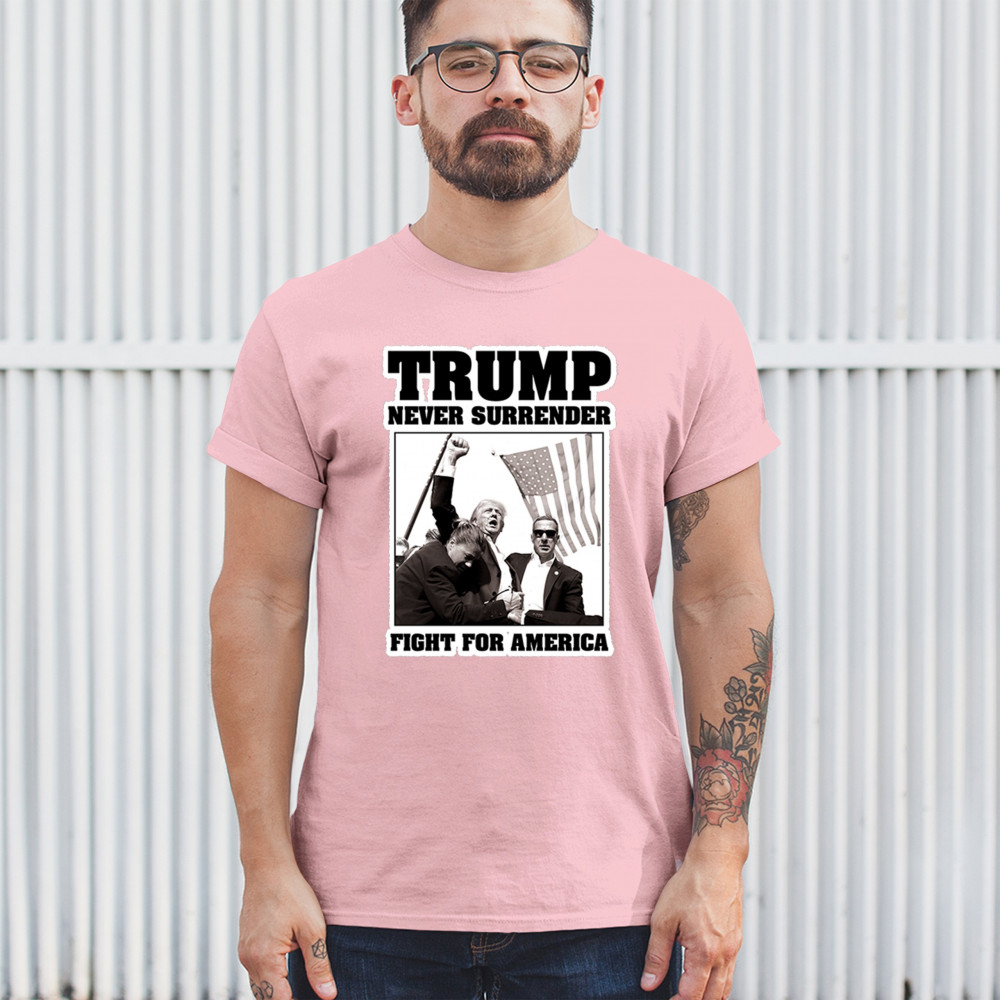 Express your unwavering support with the bold "Trump Never Surrender" design, perfect for rallies and everyday wear. Durable and stylish, show your patriotism proudly.