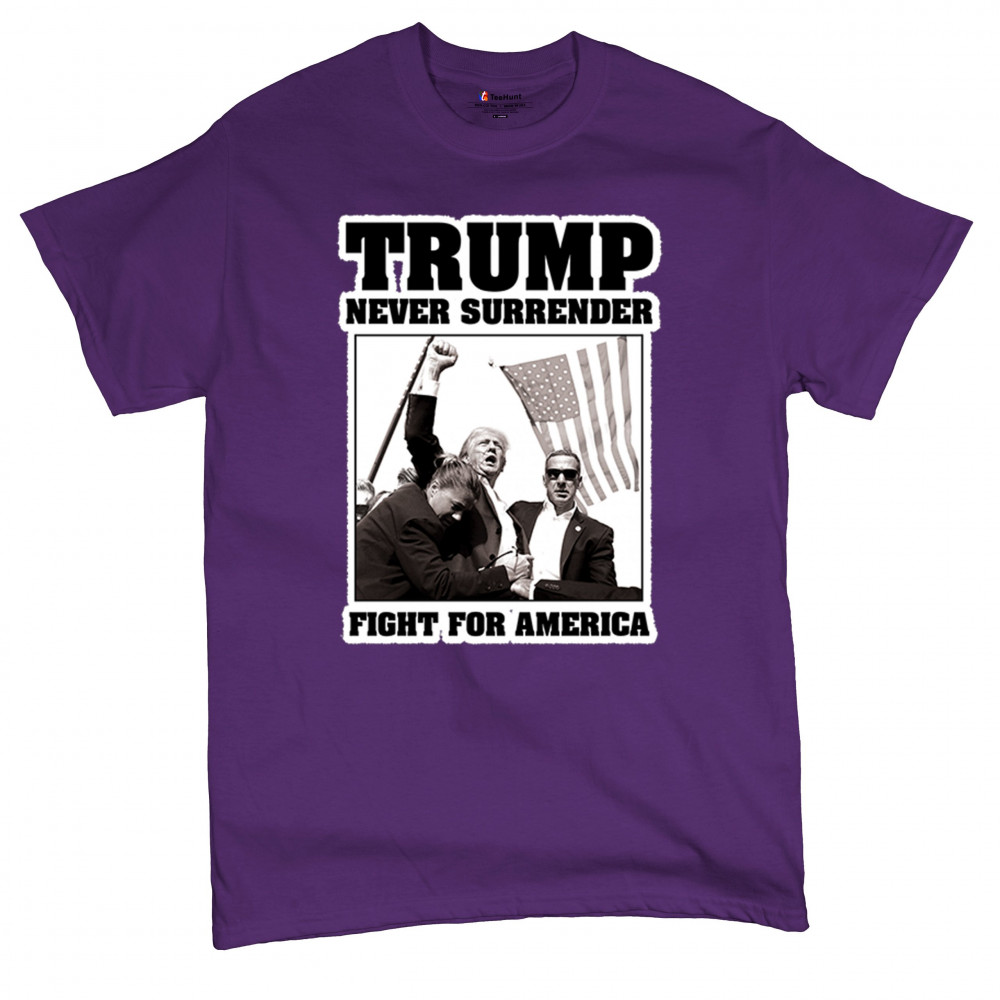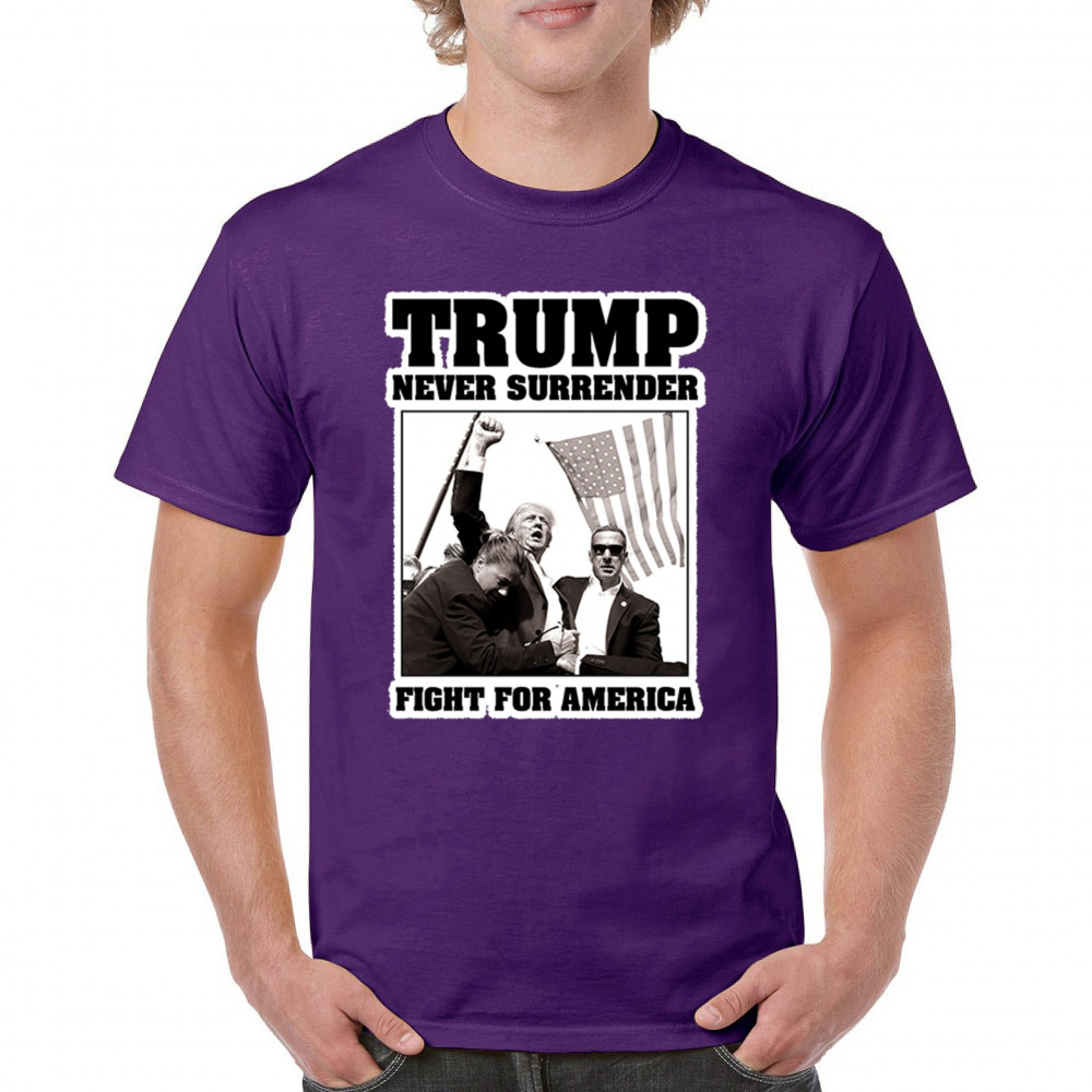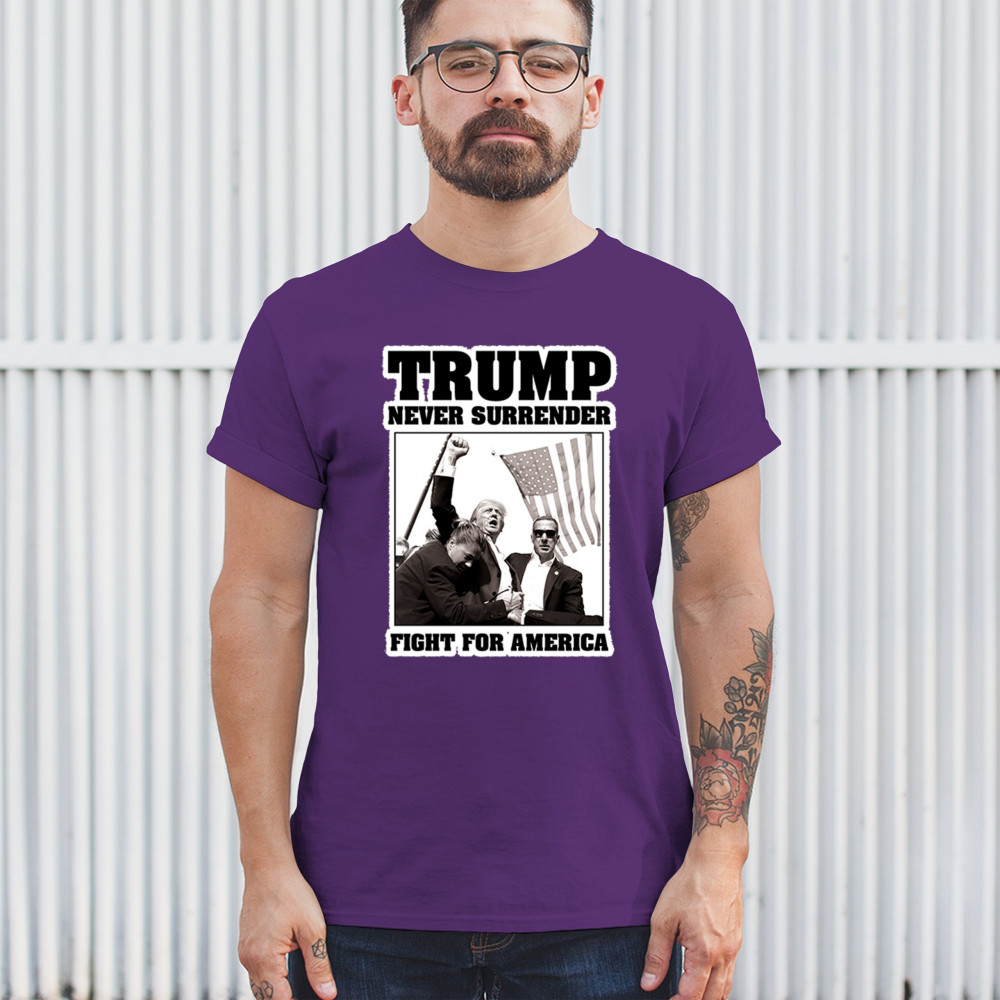 Express your unwavering support with the bold "Trump Never Surrender" design, perfect for rallies and everyday wear. Durable and stylish, show your patriotism proudly.