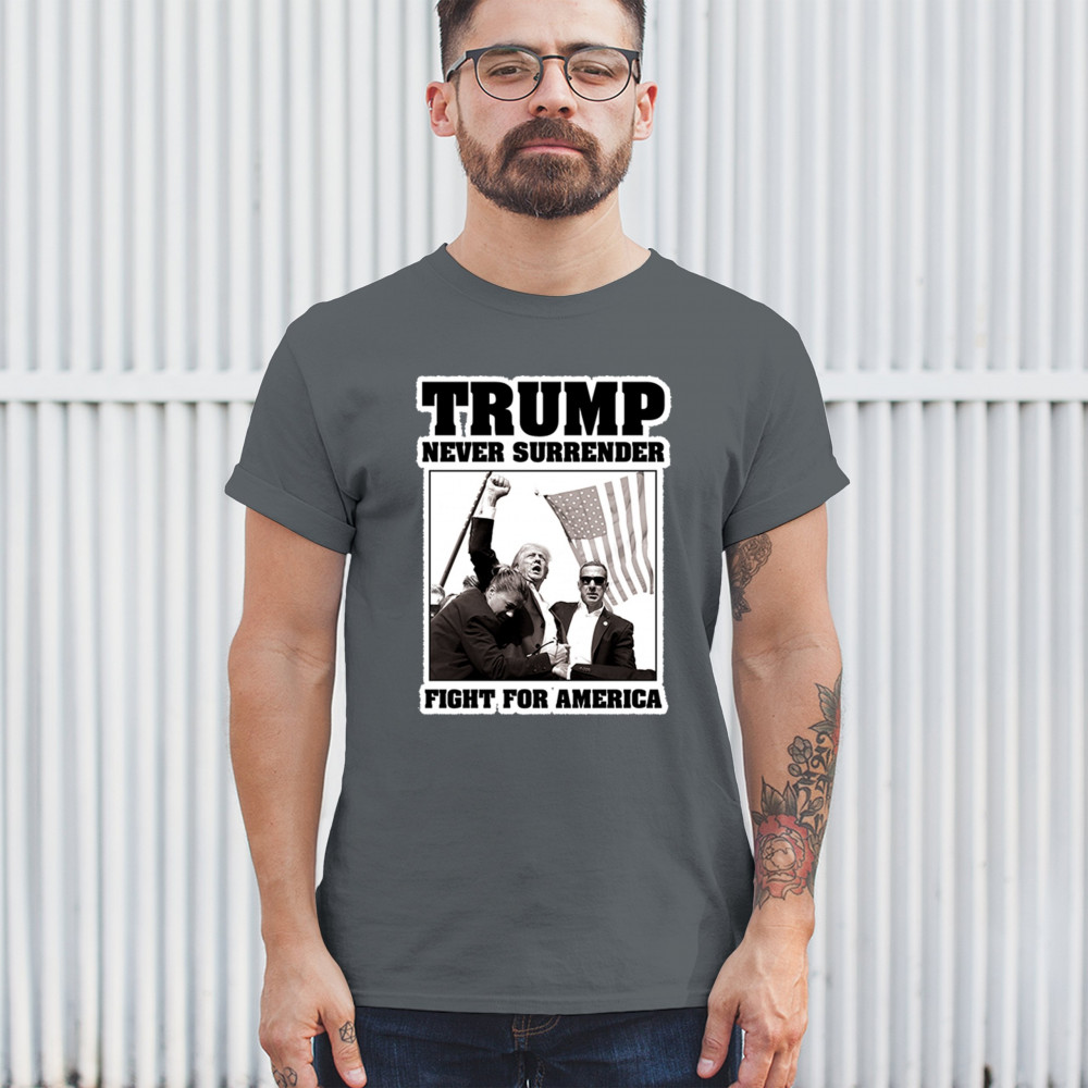 Express your unwavering support with the bold "Trump Never Surrender" design, perfect for rallies and everyday wear. Durable and stylish, show your patriotism proudly.