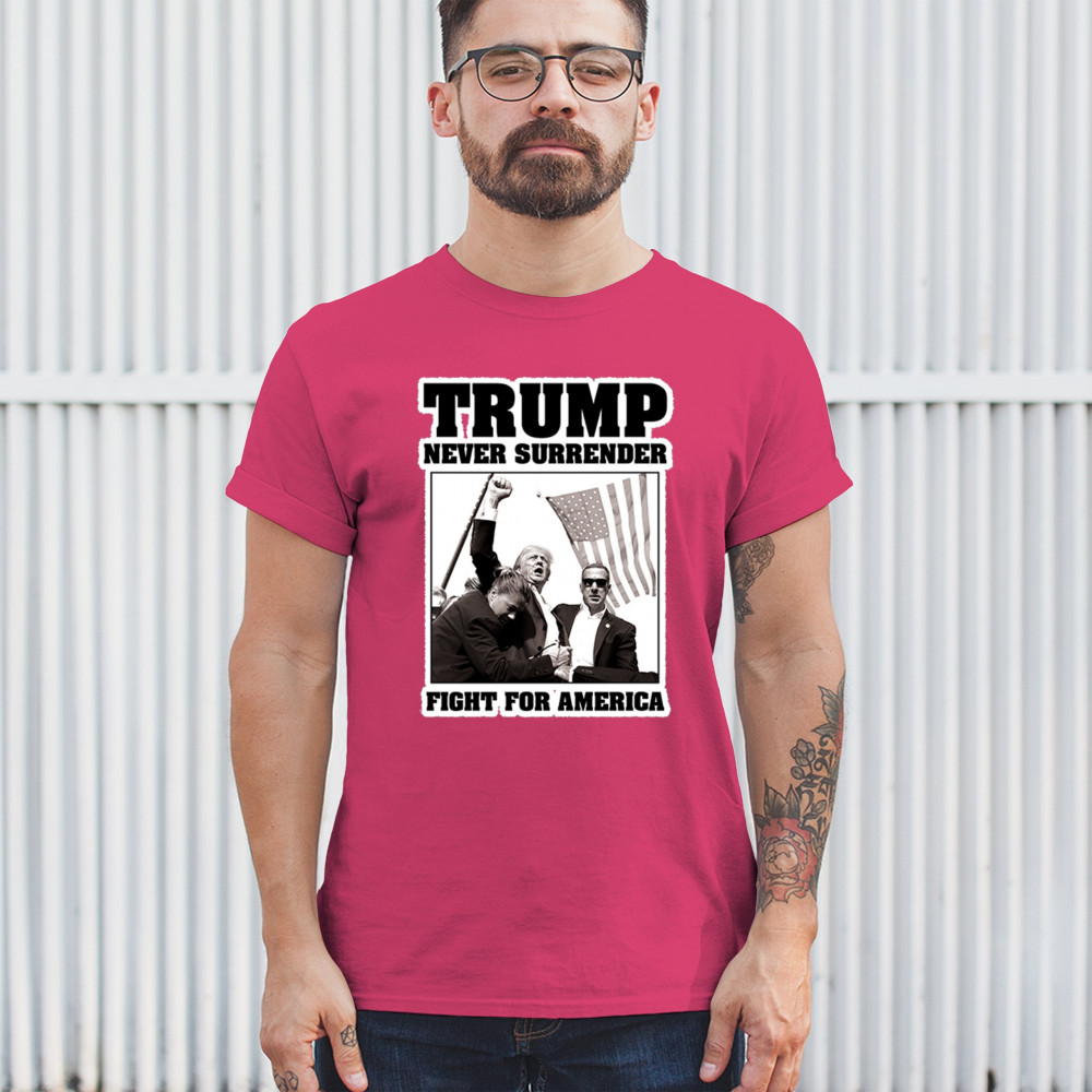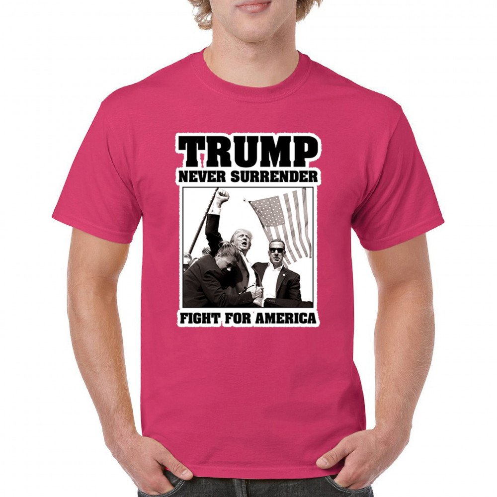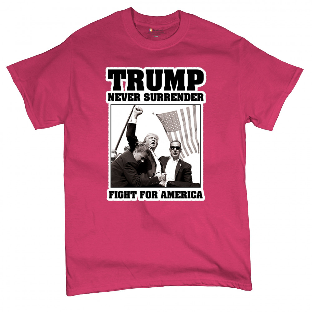 Express your unwavering support with the bold "Trump Never Surrender" design, perfect for rallies and everyday wear. Durable and stylish, show your patriotism proudly.