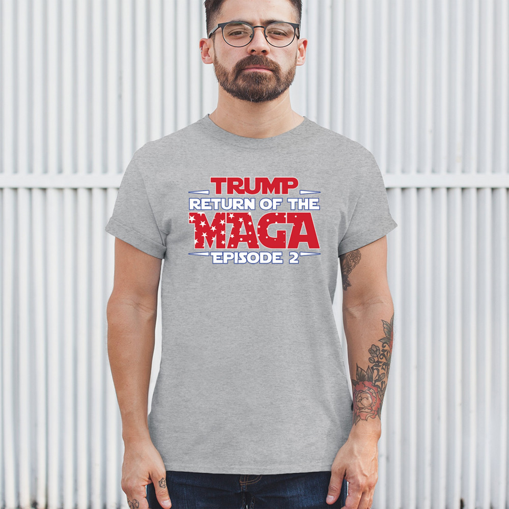 Make a bold statement with the "Return of the MAGA: Episode 2" design, celebrating Donald J. Trump and the Red Wave movement. Perfect for conservatives, Trump supporters, and Republicans who champion America First values, freedom, and the fight for a better future. A must-have for those who never surrender and stand for the people's mandate.