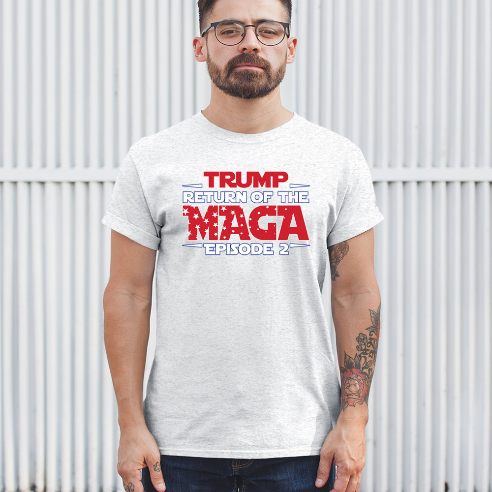 Make a bold statement with the "Return of the MAGA: Episode 2" design, celebrating Donald J. Trump and the Red Wave movement. Perfect for conservatives, Trump supporters, and Republicans who champion America First values, freedom, and the fight for a better future. A must-have for those who never surrender and stand for the people's mandate.