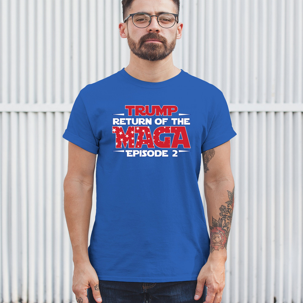 Make a bold statement with the "Return of the MAGA: Episode 2" design, celebrating Donald J. Trump and the Red Wave movement. Perfect for conservatives, Trump supporters, and Republicans who champion America First values, freedom, and the fight for a better future. A must-have for those who never surrender and stand for the people's mandate.