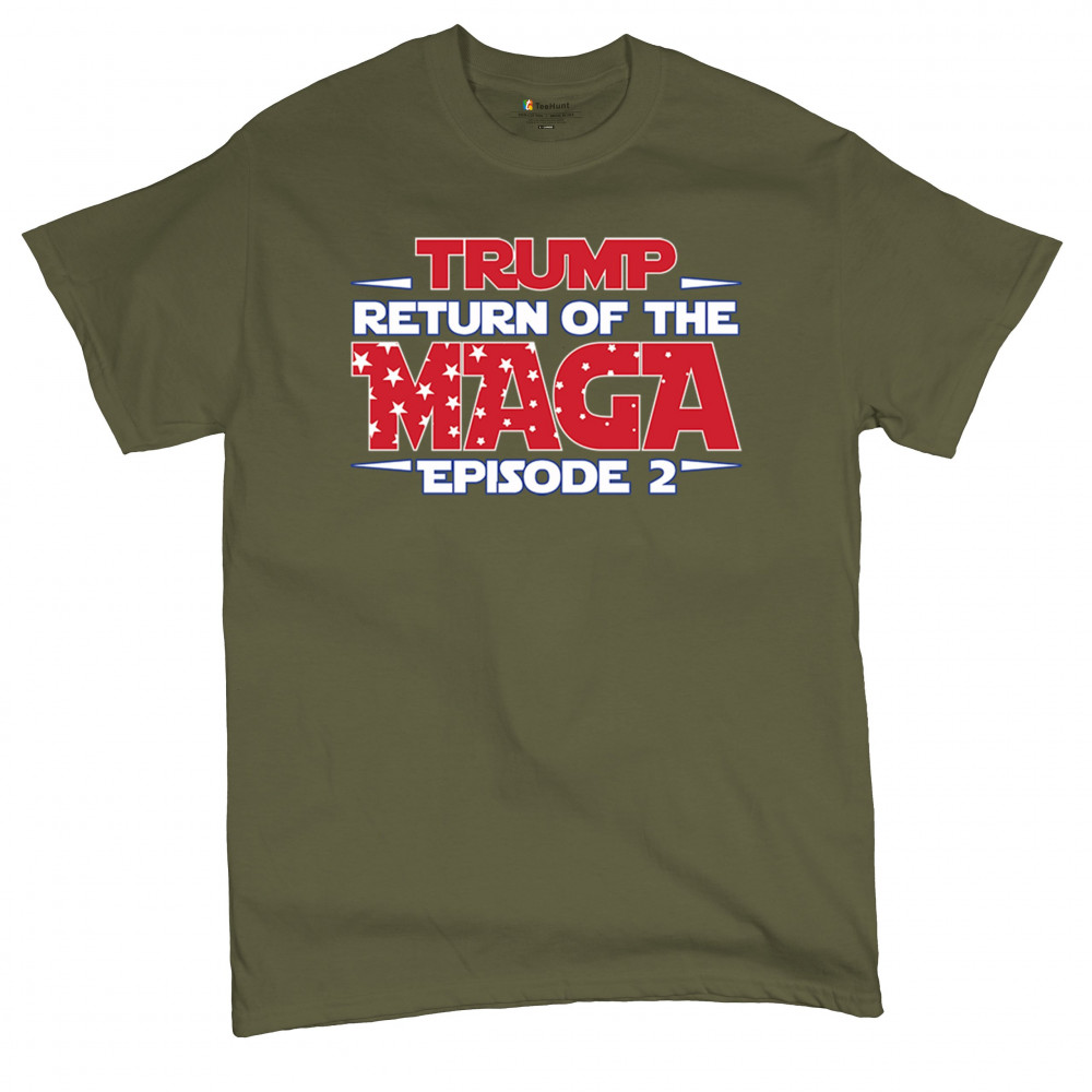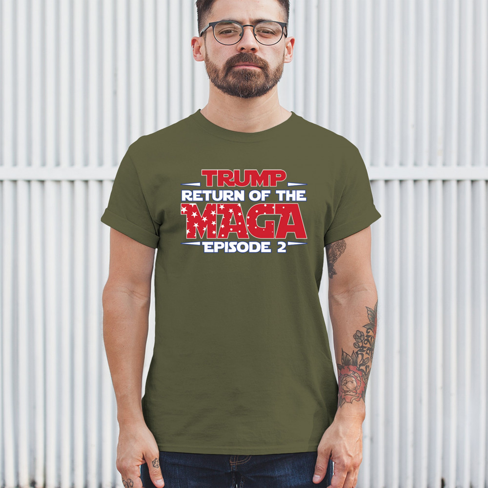 Make a bold statement with the "Return of the MAGA: Episode 2" design, celebrating Donald J. Trump and the Red Wave movement. Perfect for conservatives, Trump supporters, and Republicans who champion America First values, freedom, and the fight for a better future. A must-have for those who never surrender and stand for the people's mandate.