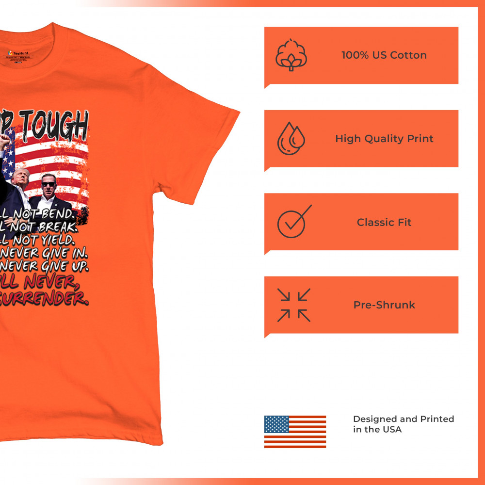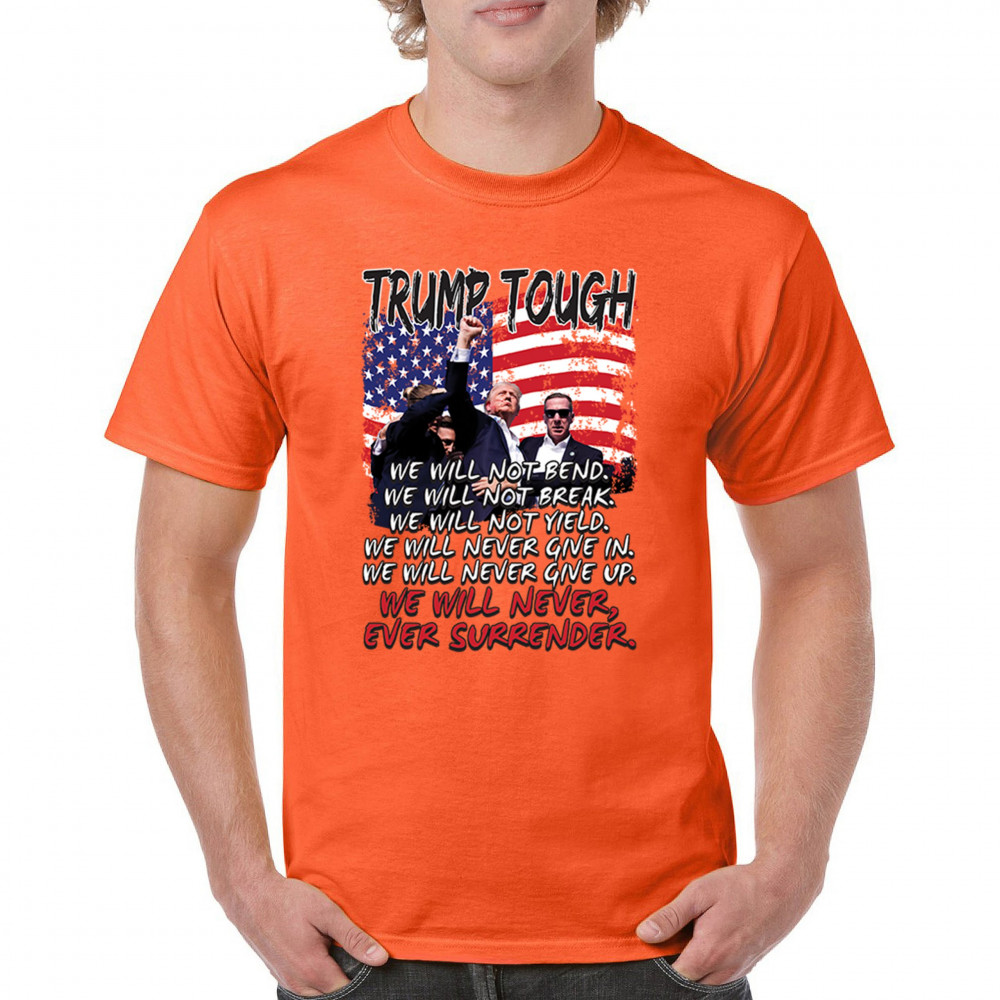 Display your unwavering support for Donald Trump with this powerful design. Crafted for those who believe in conservative values and the America First agenda, it’s perfect for any rally or event. With a striking image and the American flag in the background, this design embodies the spirit of those who refuse to give up or surrender. Show your dedication and pride every time you wear this. Join the movement and stand firm in your beliefs.