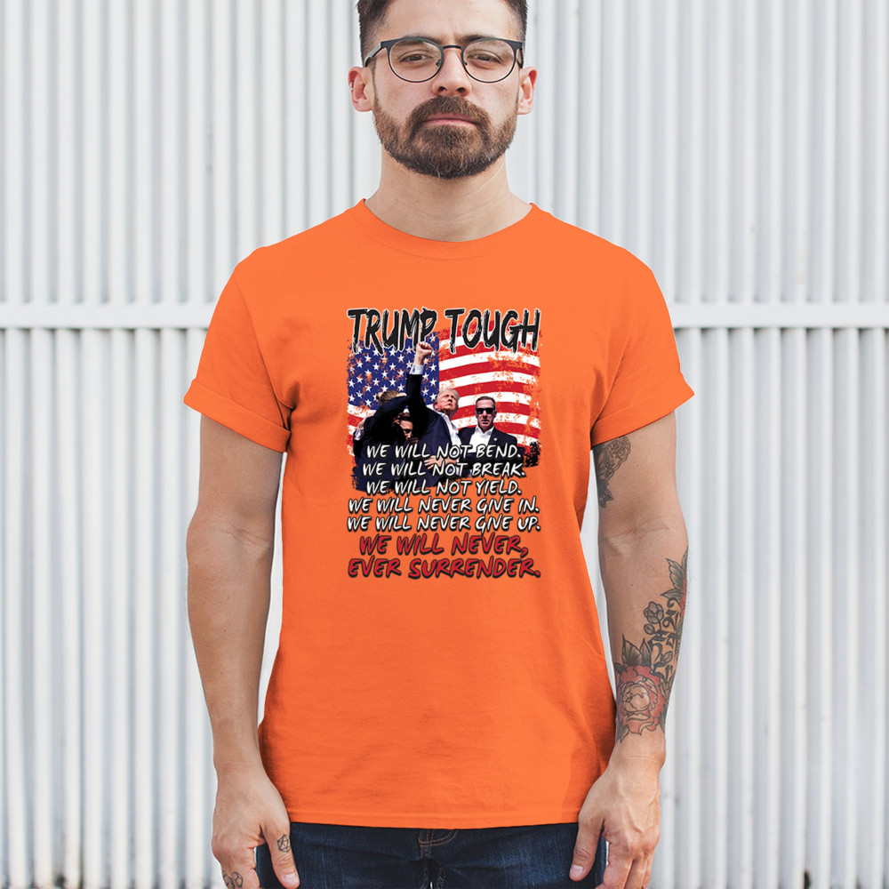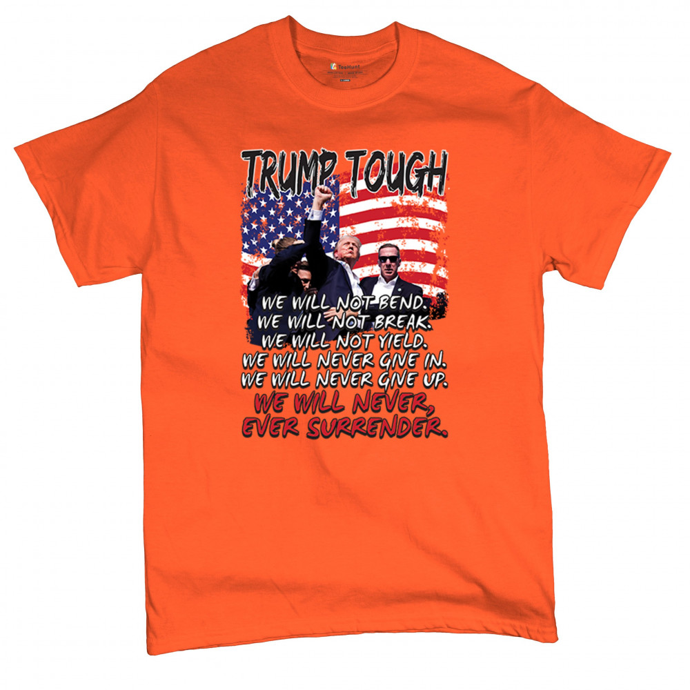 Express your support for Trump 2024 with this bold, patriotic design featuring the American flag and a powerful message. Never surrender your values.