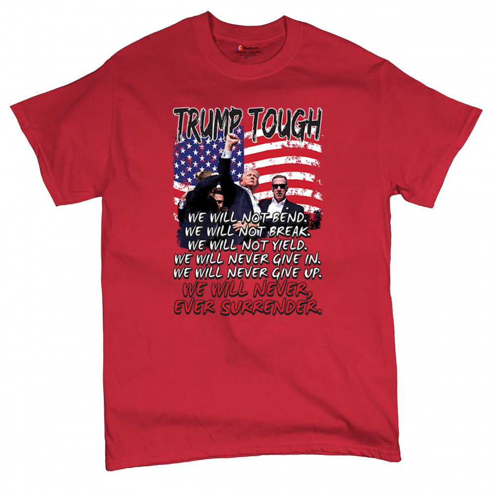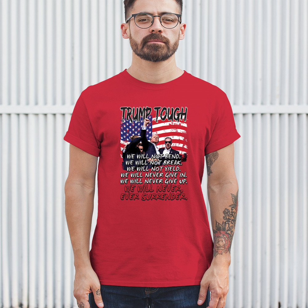 Express your support for Trump 2024 with this bold, patriotic design featuring the American flag and a powerful message. Never surrender your values.