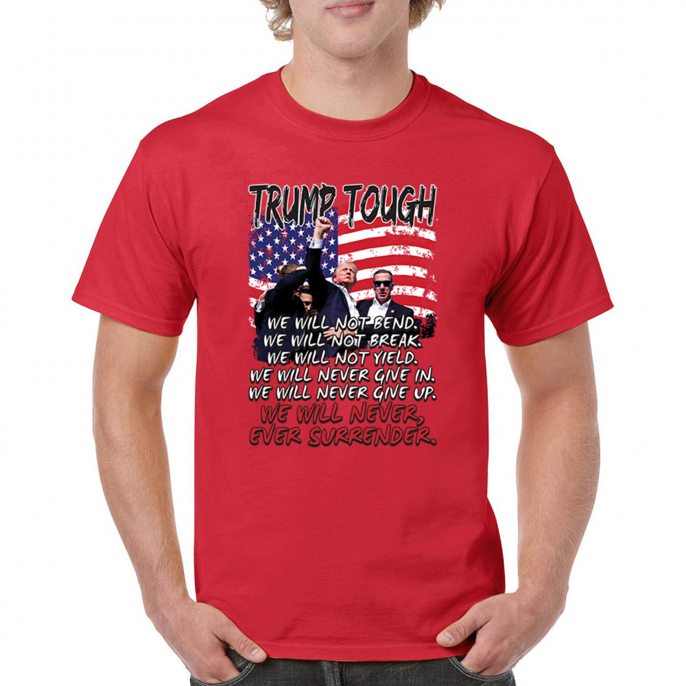 Display your unwavering support for Donald Trump with this powerful design. Crafted for those who believe in conservative values and the America First agenda, it’s perfect for any rally or event. With a striking image and the American flag in the background, this design embodies the spirit of those who refuse to give up or surrender. Show your dedication and pride every time you wear this. Join the movement and stand firm in your beliefs.