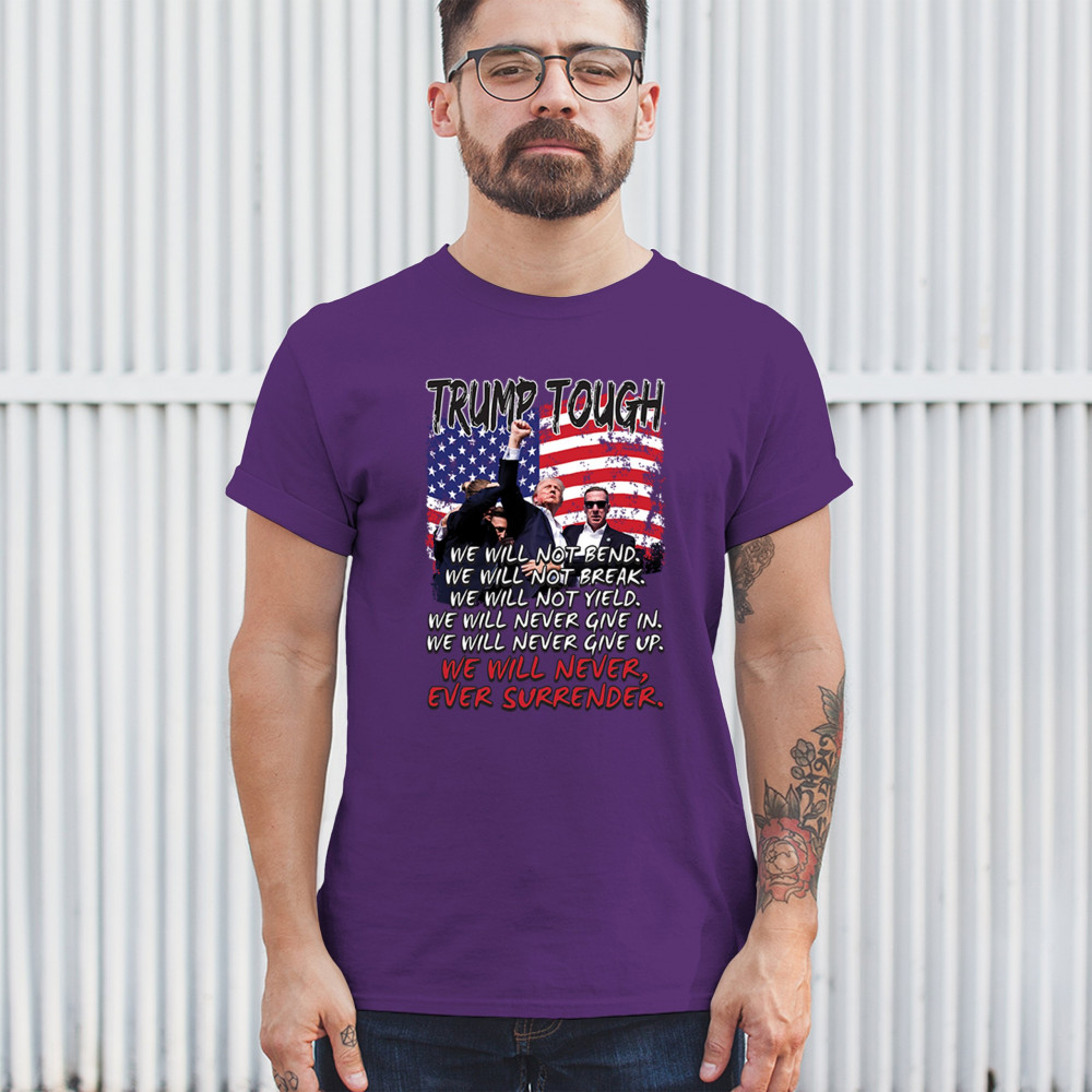 Express your support for Trump 2024 with this bold, patriotic design featuring the American flag and a powerful message. Never surrender your values.