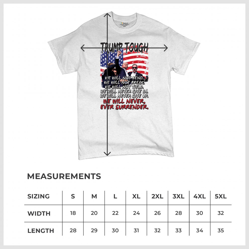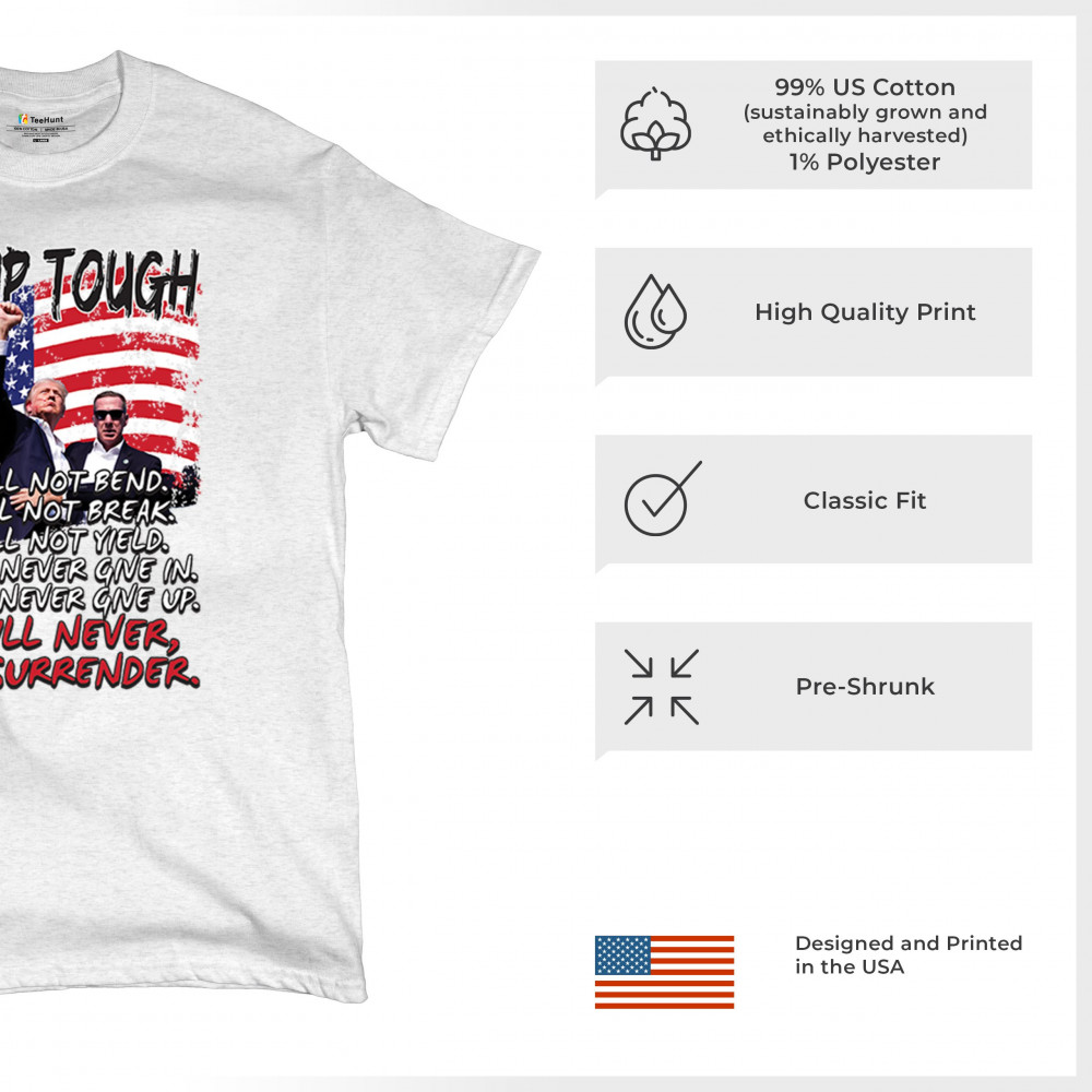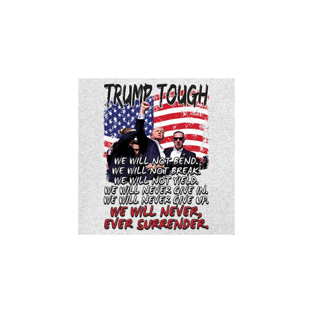 Display your unwavering support for Donald Trump with this powerful design. Crafted for those who believe in conservative values and the America First agenda, it’s perfect for any rally or event. With a striking image and the American flag in the background, this design embodies the spirit of those who refuse to give up or surrender. Show your dedication and pride every time you wear this. Join the movement and stand firm in your beliefs.
