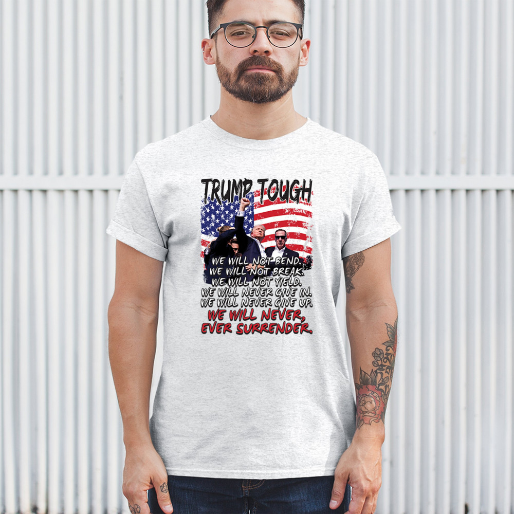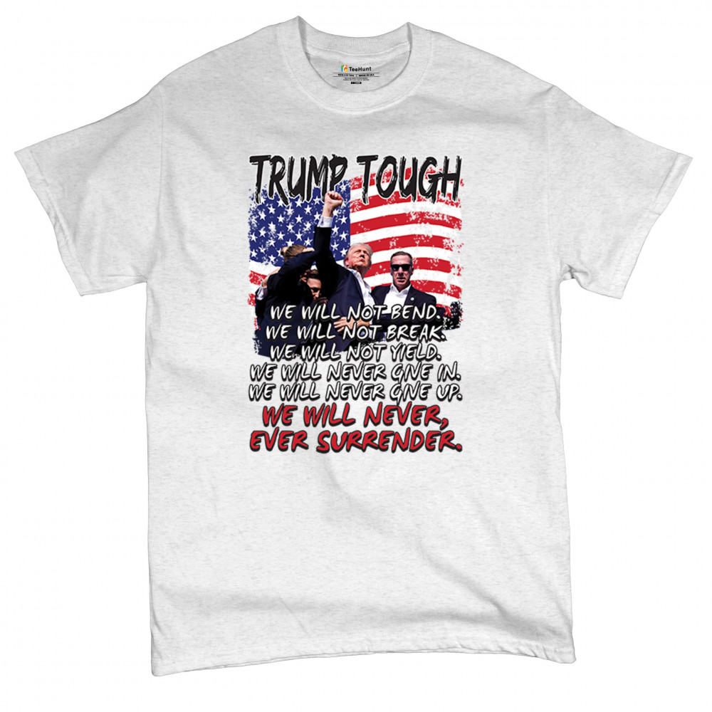 Express your support for Trump 2024 with this bold, patriotic design featuring the American flag and a powerful message. Never surrender your values.