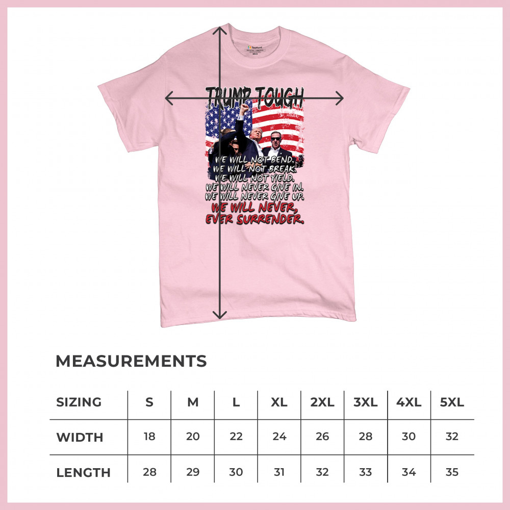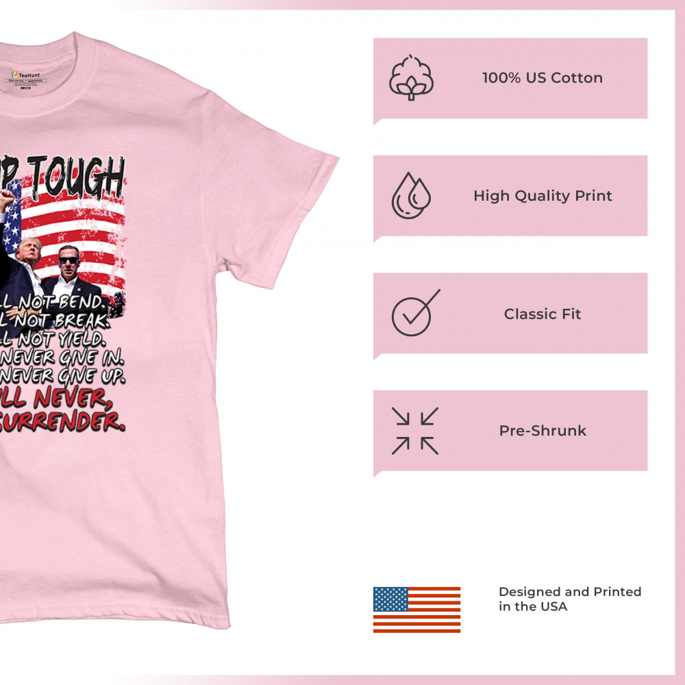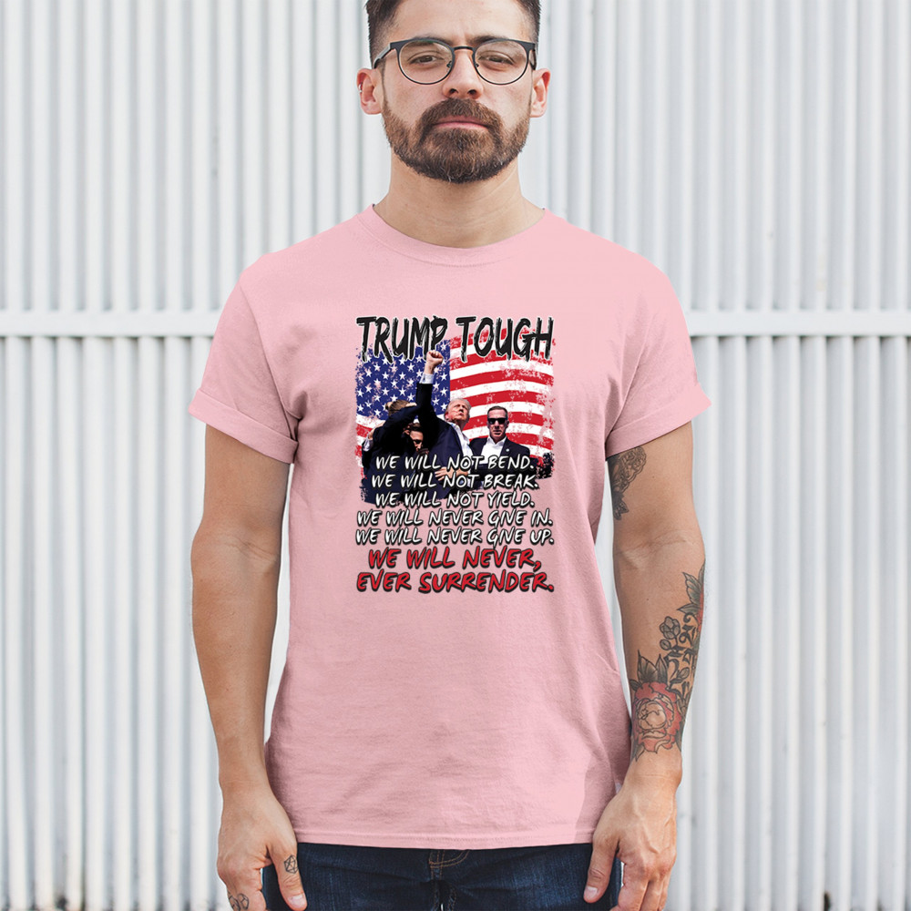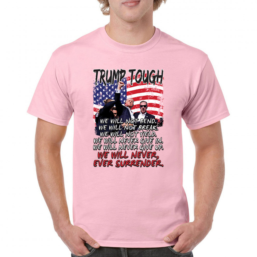 Display your unwavering support for Donald Trump with this powerful design. Crafted for those who believe in conservative values and the America First agenda, it’s perfect for any rally or event. With a striking image and the American flag in the background, this design embodies the spirit of those who refuse to give up or surrender. Show your dedication and pride every time you wear this. Join the movement and stand firm in your beliefs.