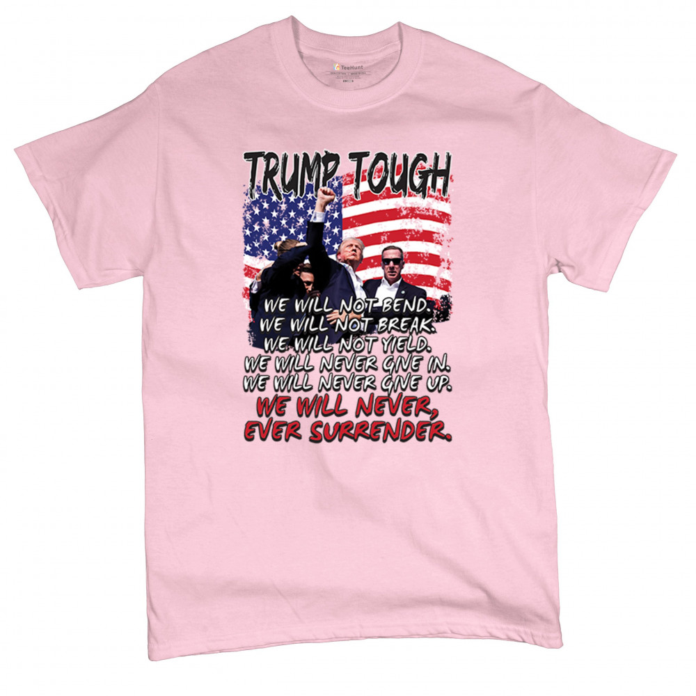 Express your support for Trump 2024 with this bold, patriotic design featuring the American flag and a powerful message. Never surrender your values.