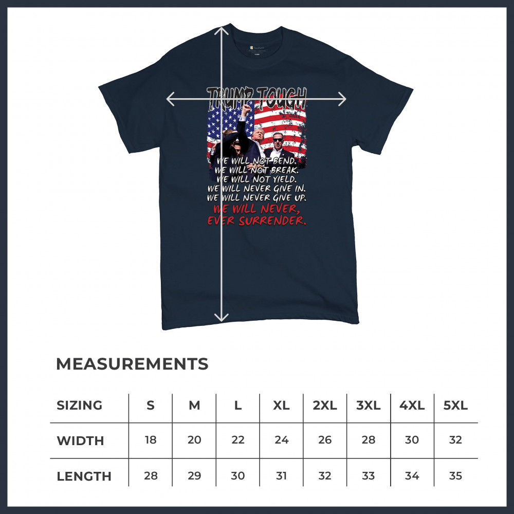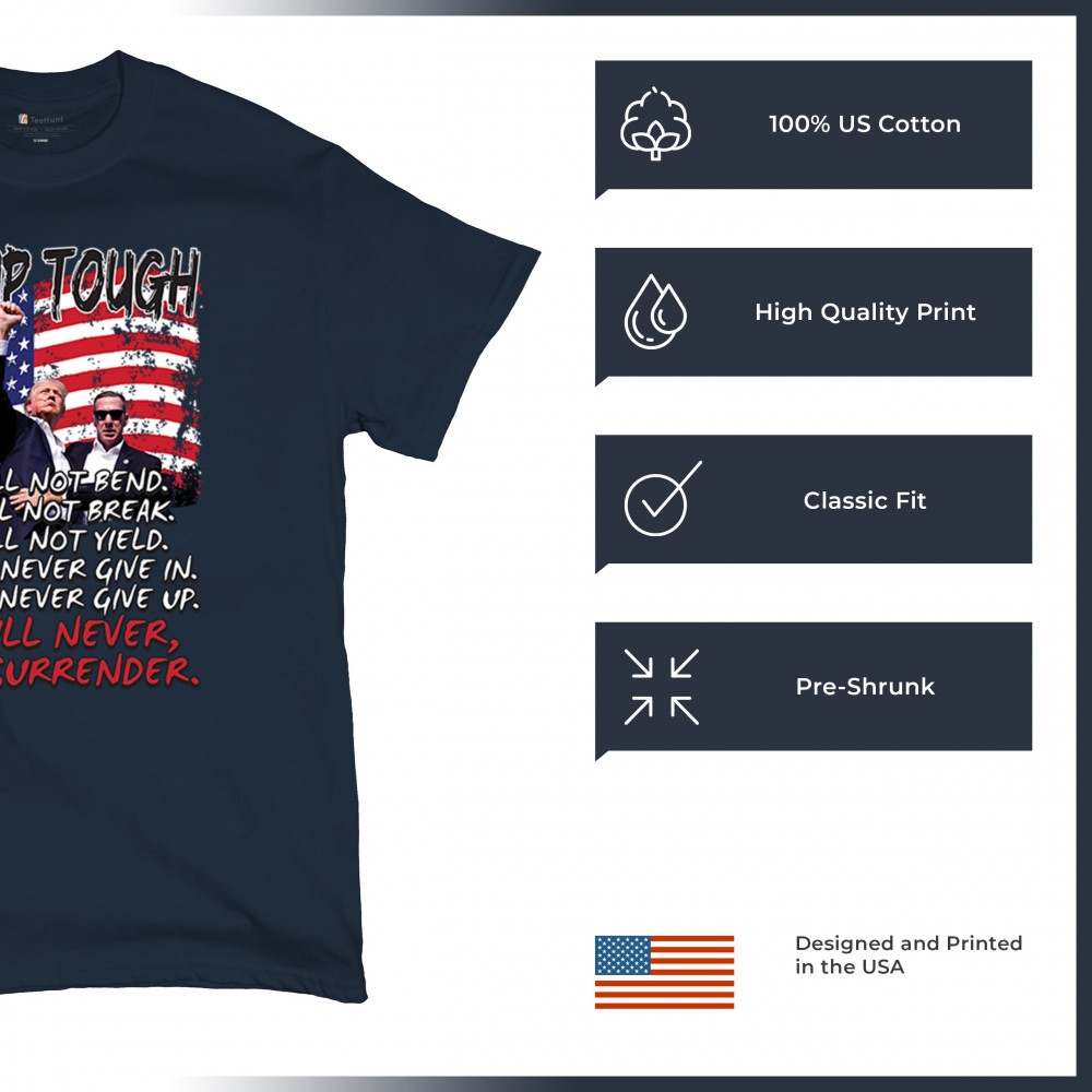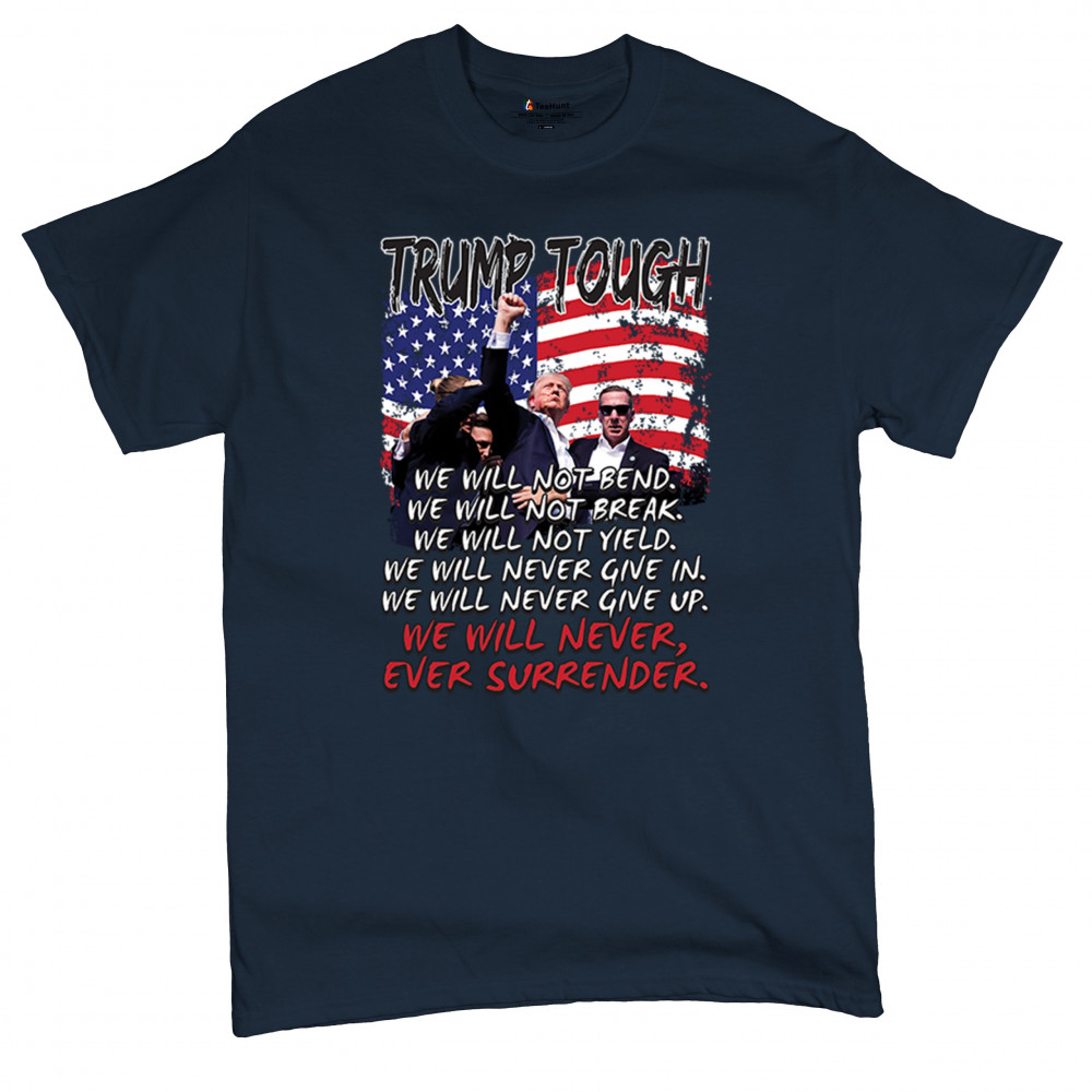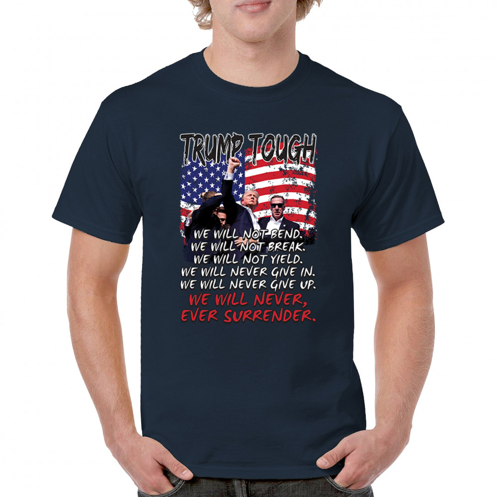 Display your unwavering support for Donald Trump with this powerful design. Crafted for those who believe in conservative values and the America First agenda, it’s perfect for any rally or event. With a striking image and the American flag in the background, this design embodies the spirit of those who refuse to give up or surrender. Show your dedication and pride every time you wear this. Join the movement and stand firm in your beliefs.