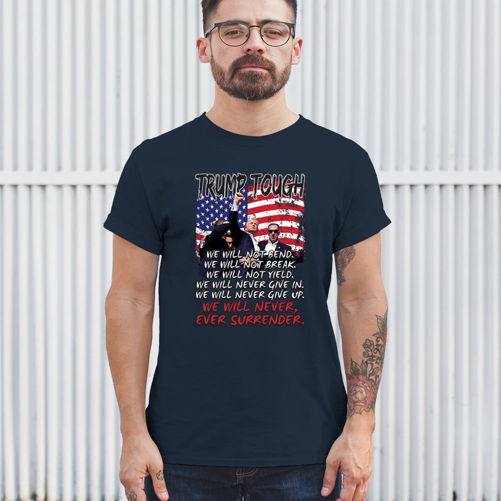 Express your support for Trump 2024 with this bold, patriotic design featuring the American flag and a powerful message. Never surrender your values.
