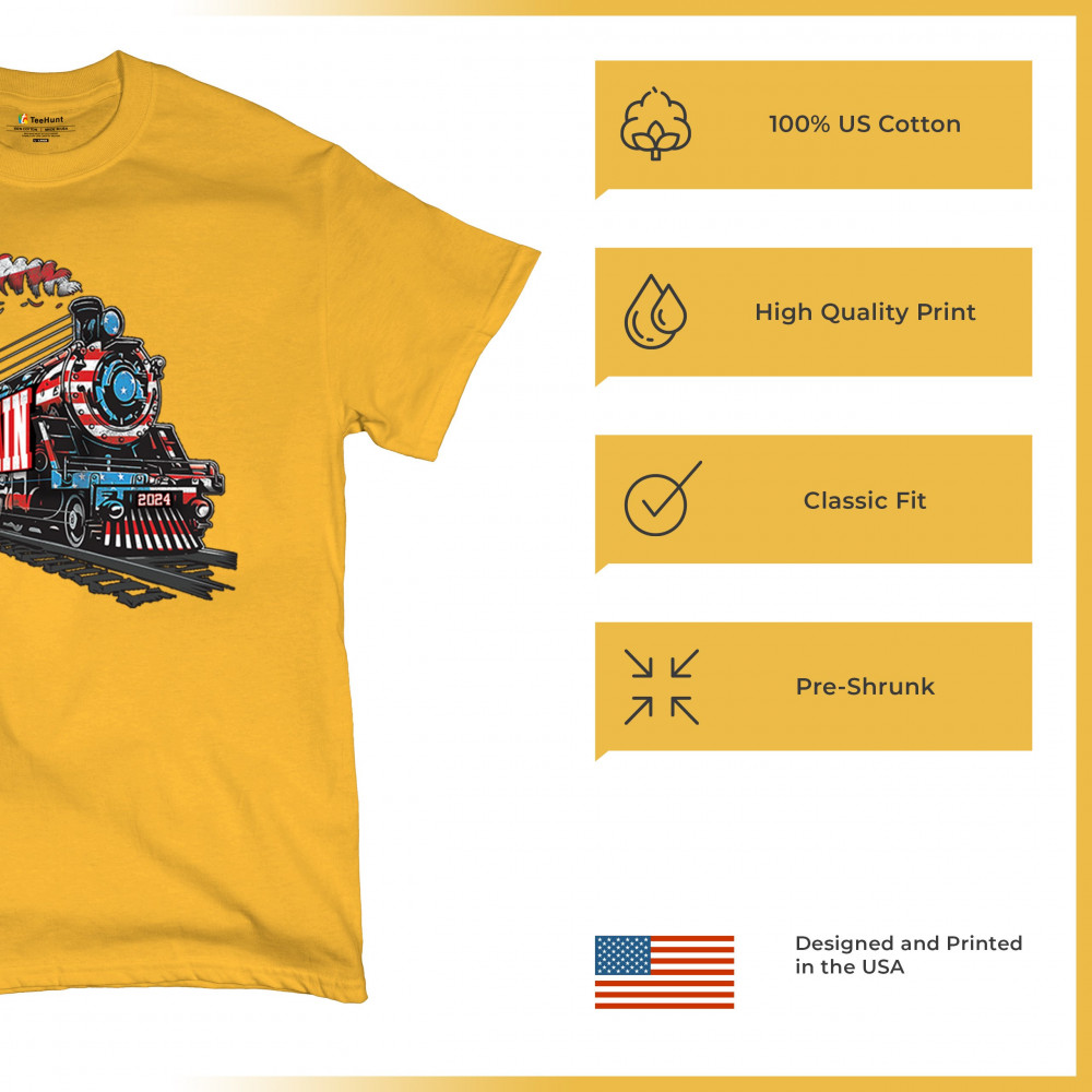 Celebrate the Trump Train with this bold, patriotic design. Featuring a steam engine wrapped in the American flag, this tee is perfect for Trump supporters and conservatives looking to make a statement. Join the Red Wave, fight for victory, and showcase your support for the 47th President. Whether at rallies or casual events, this design represents we the people have spoken and the push for 4 More Years.