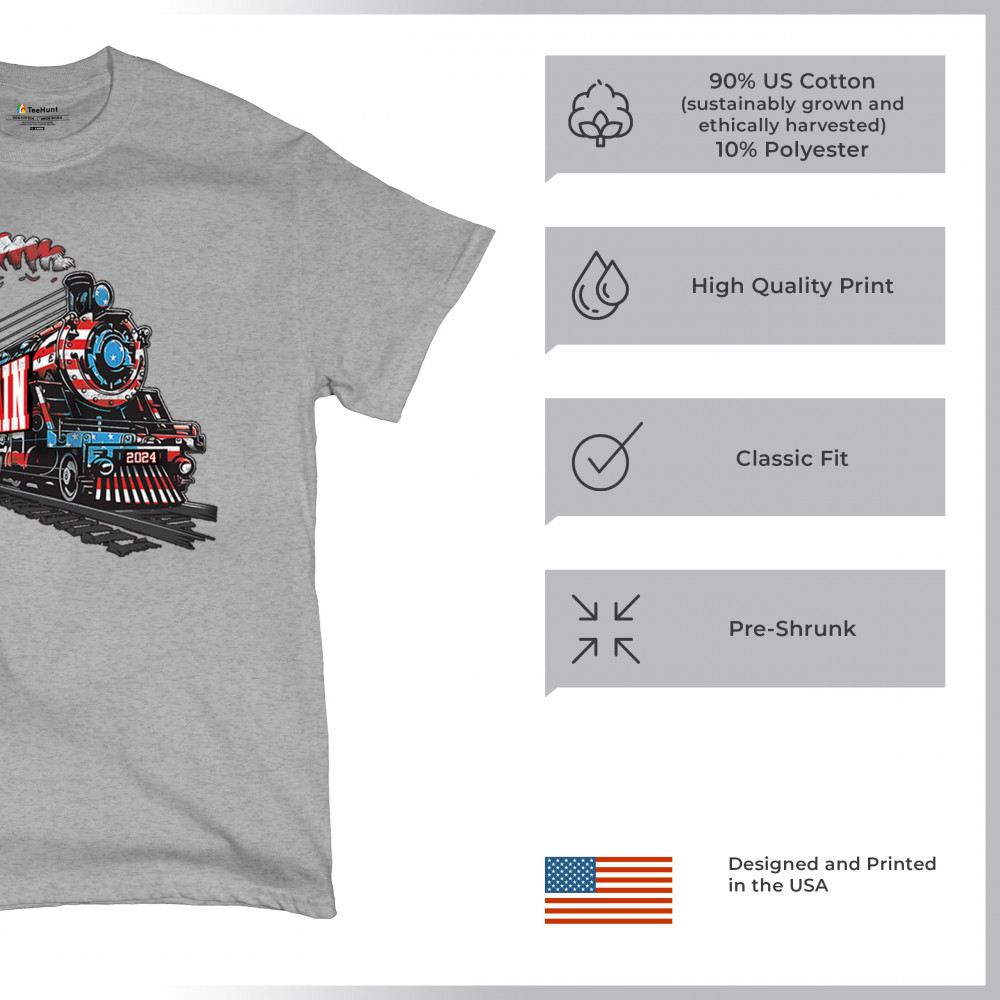 Celebrate the Trump Train with this bold, patriotic design. Featuring a steam engine wrapped in the American flag, this tee is perfect for Trump supporters and conservatives looking to make a statement. Join the Red Wave, fight for victory, and showcase your support for the 47th President. Whether at rallies or casual events, this design represents we the people have spoken and the push for 4 More Years.