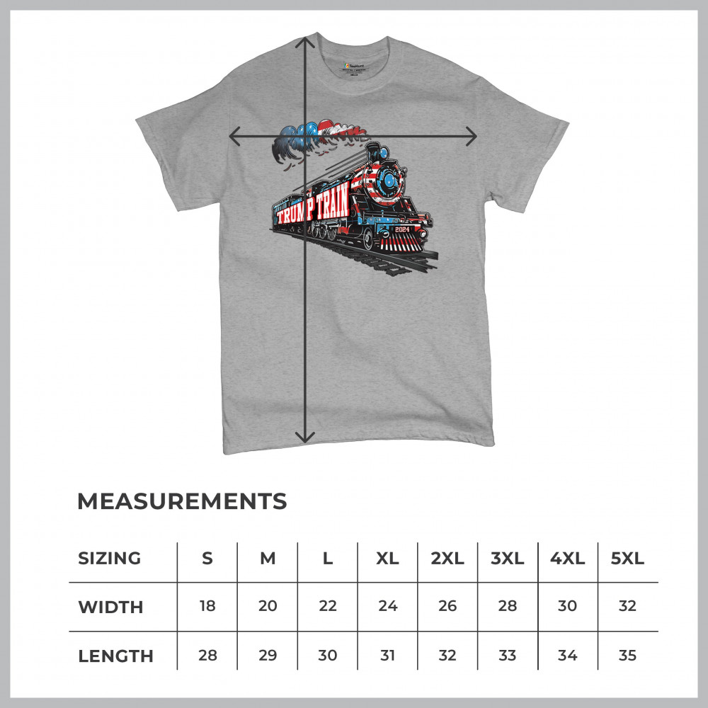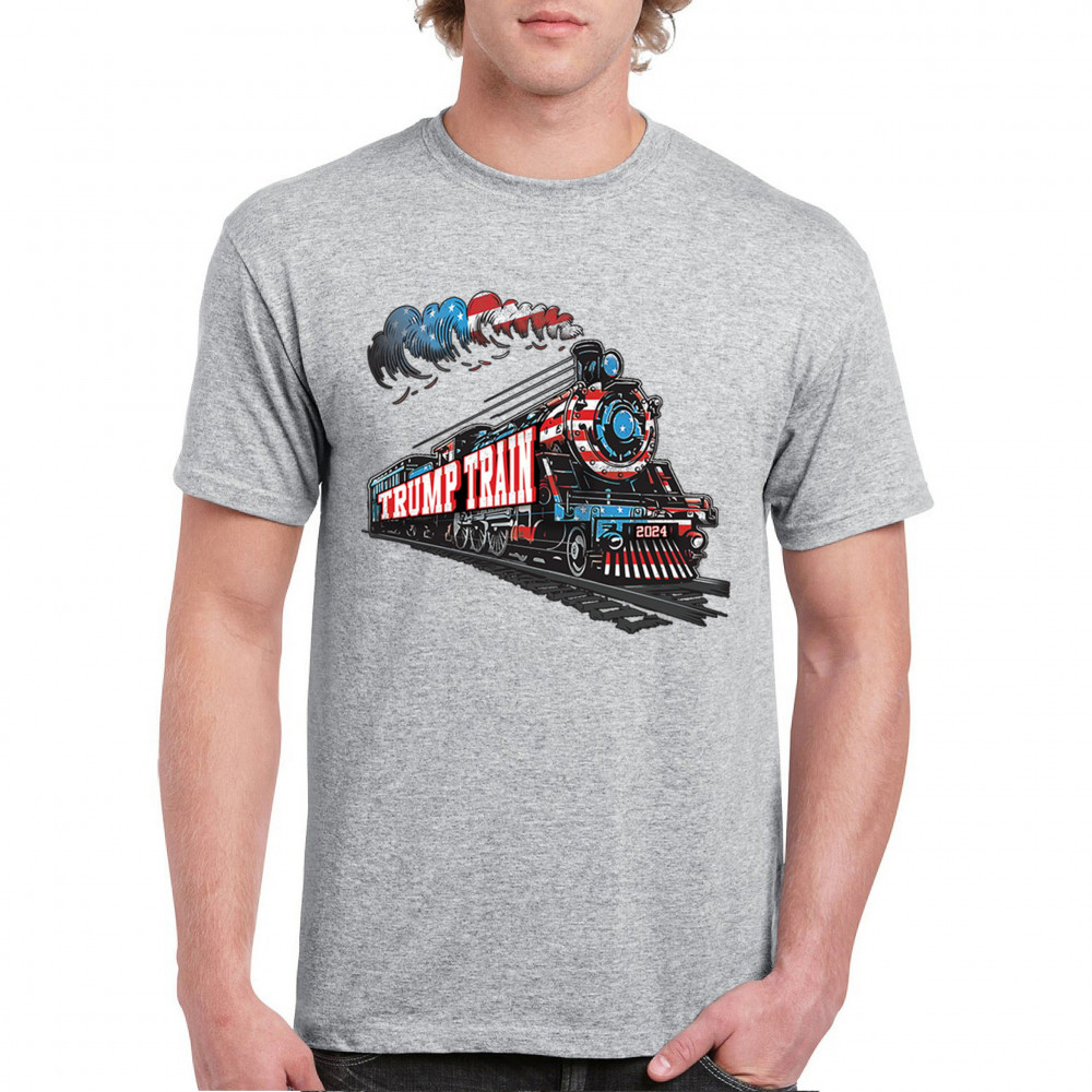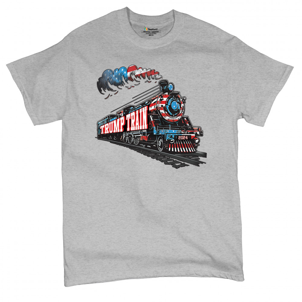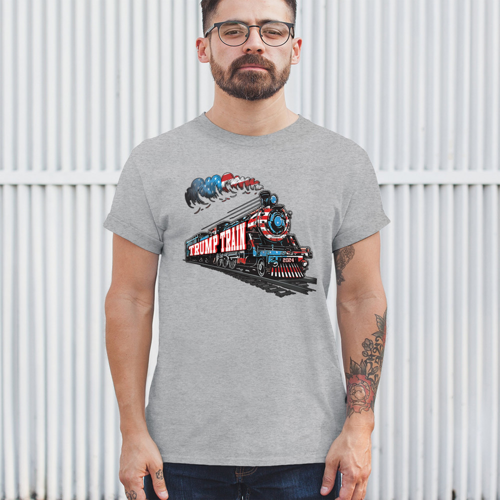 Hop on the Trump Train and support America First! This bold, patriotic tee is perfect for Republicans, conservatives, and the Red Wave movement.