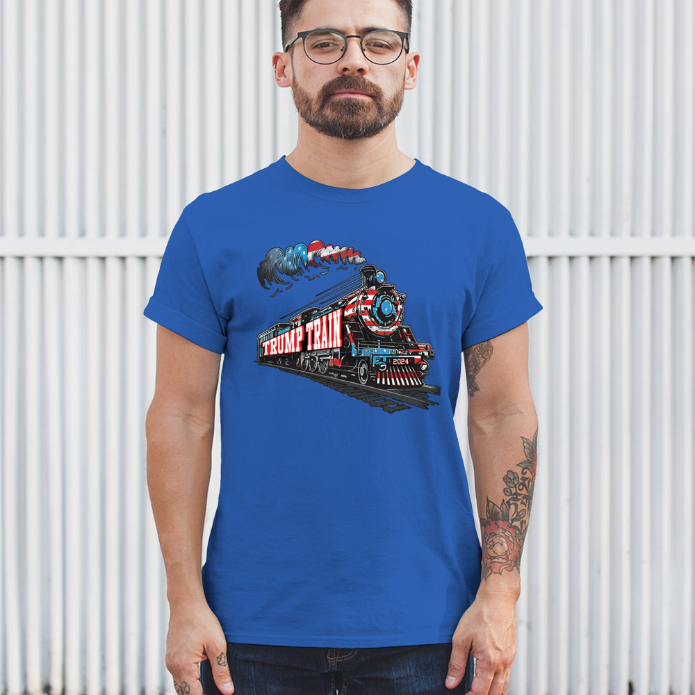 Celebrate the Trump Train with this bold, patriotic design. Featuring a steam engine wrapped in the American flag, this tee is perfect for Trump supporters and conservatives looking to make a statement. Join the Red Wave, fight for victory, and showcase your support for the 47th President. Whether at rallies or casual events, this design represents we the people have spoken and the push for 4 More Years.