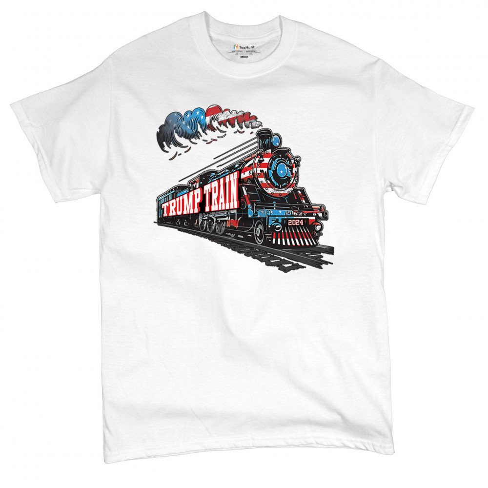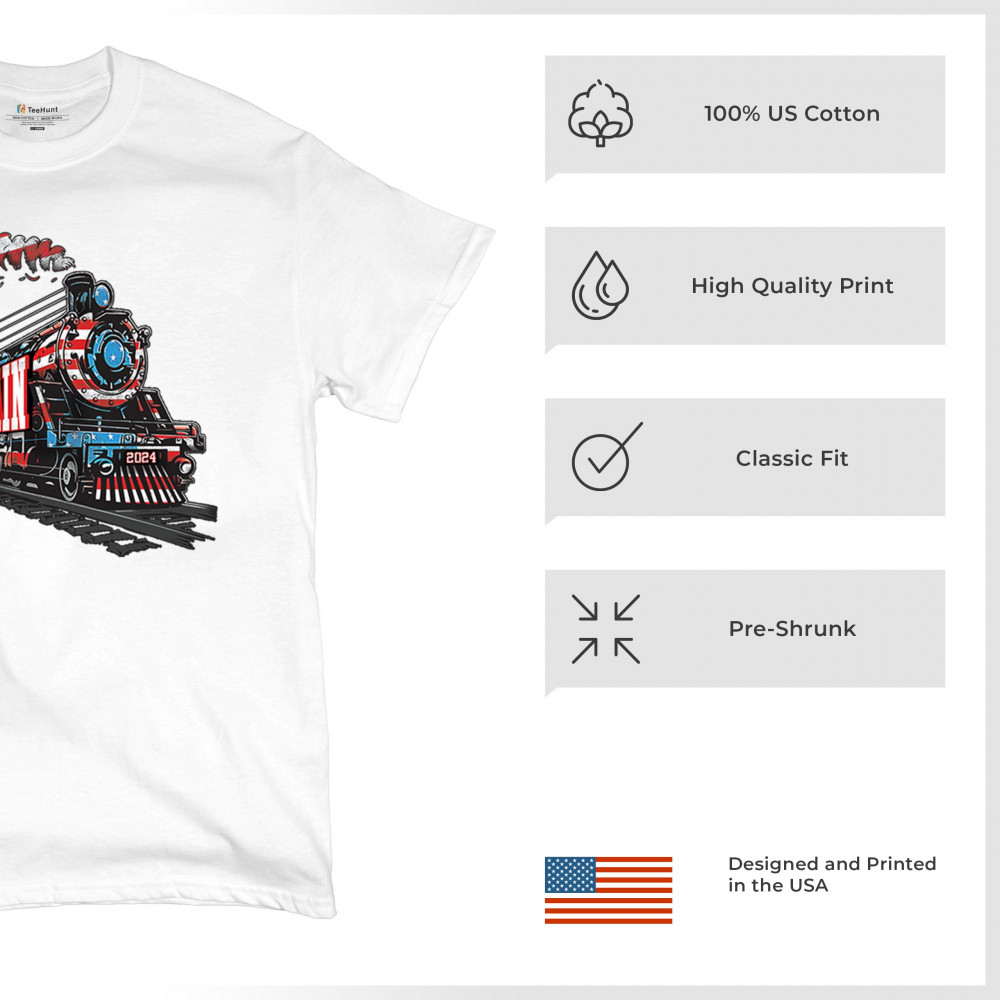 Hop on the Trump Train and support America First! This bold, patriotic tee is perfect for Republicans, conservatives, and the Red Wave movement.
