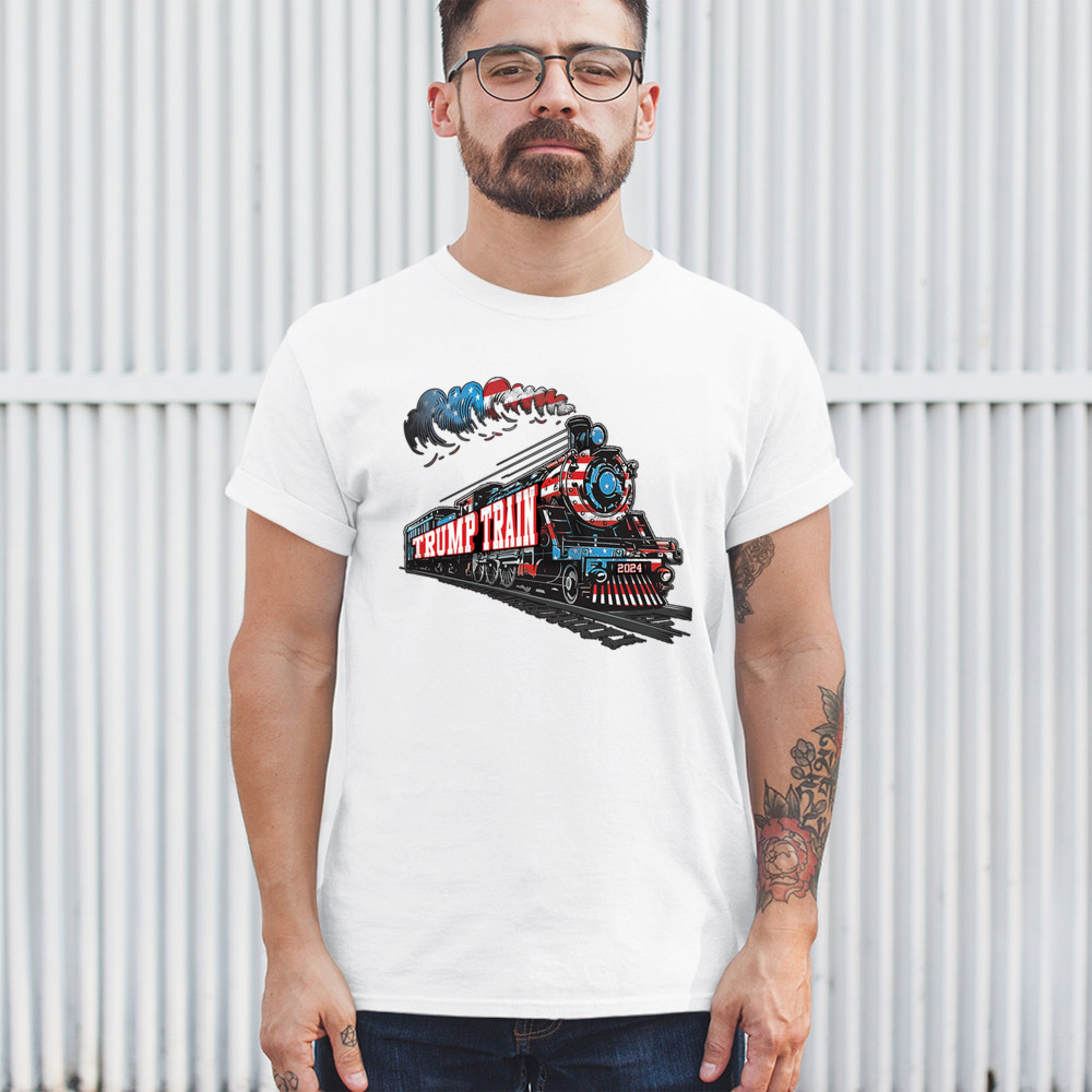 Celebrate the Trump Train with this bold, patriotic design. Featuring a steam engine wrapped in the American flag, this tee is perfect for Trump supporters and conservatives looking to make a statement. Join the Red Wave, fight for victory, and showcase your support for the 47th President. Whether at rallies or casual events, this design represents we the people have spoken and the push for 4 More Years.