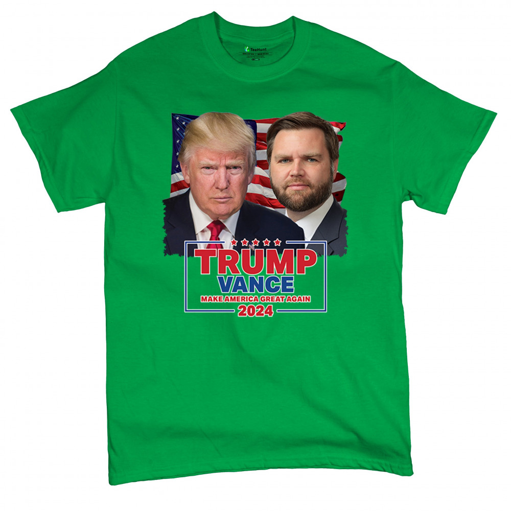 Show your support for Trump-Vance 2024 with this bold design featuring Trump and Vance against the American flag. Perfect for rallies and political events.