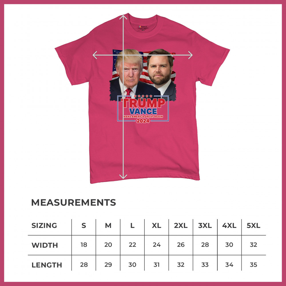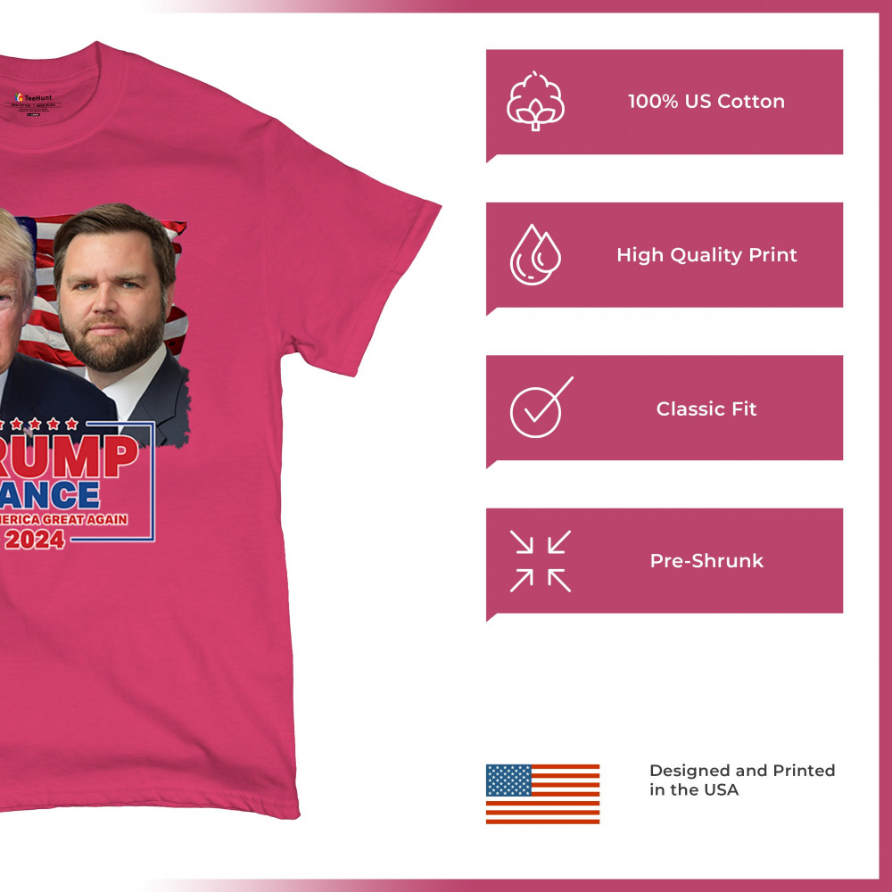 Support the Trump-Vance 2024 campaign with our exclusive design, featuring prominent images of Donald Trump and J.D. Vance set against the American flag. This design is perfect for rallies, political events, and daily wear, showcasing your dedication to the conservative movement. Its bold graphics and patriotic theme make it a standout piece for any supporter. Join the movement and proudly display your support with this dynamic and inspiring design.